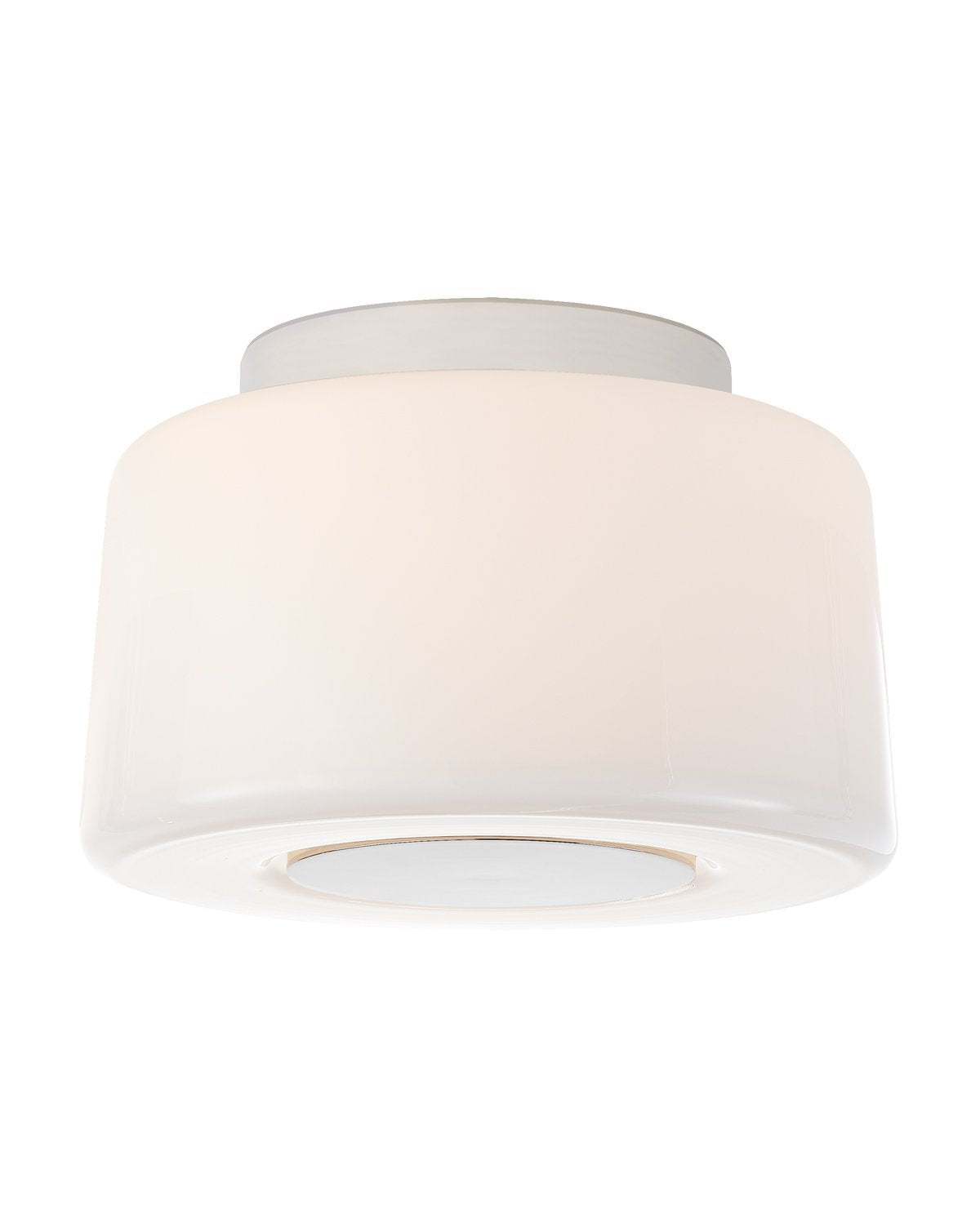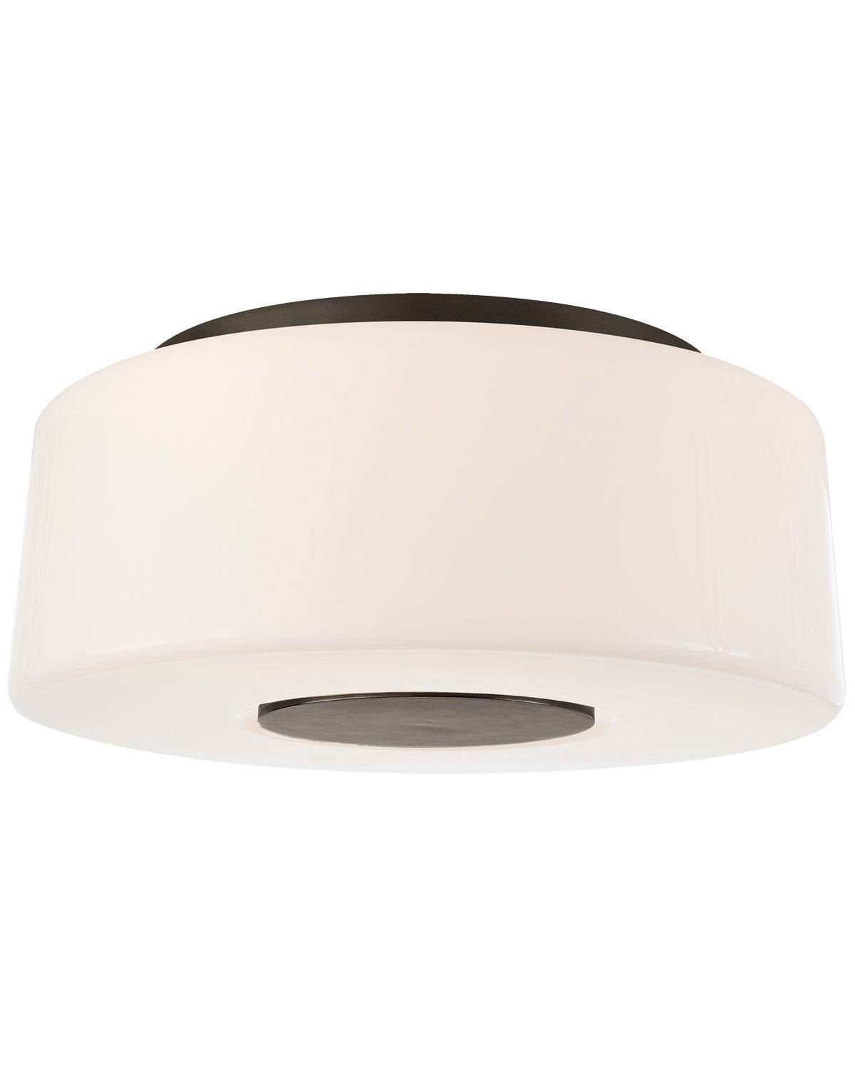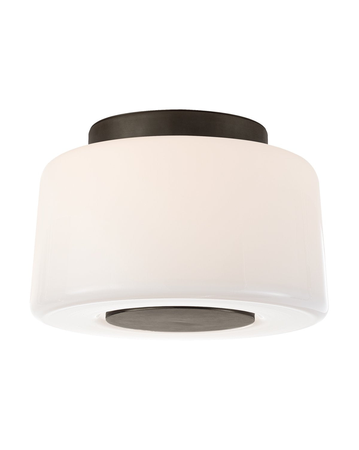 Simple and transitional, the clean silhouette of the Acme Flushmount will work in any home. The schoolhouse vibes of the white glass are contrasted by a metal plate accent in the finish of your choice.