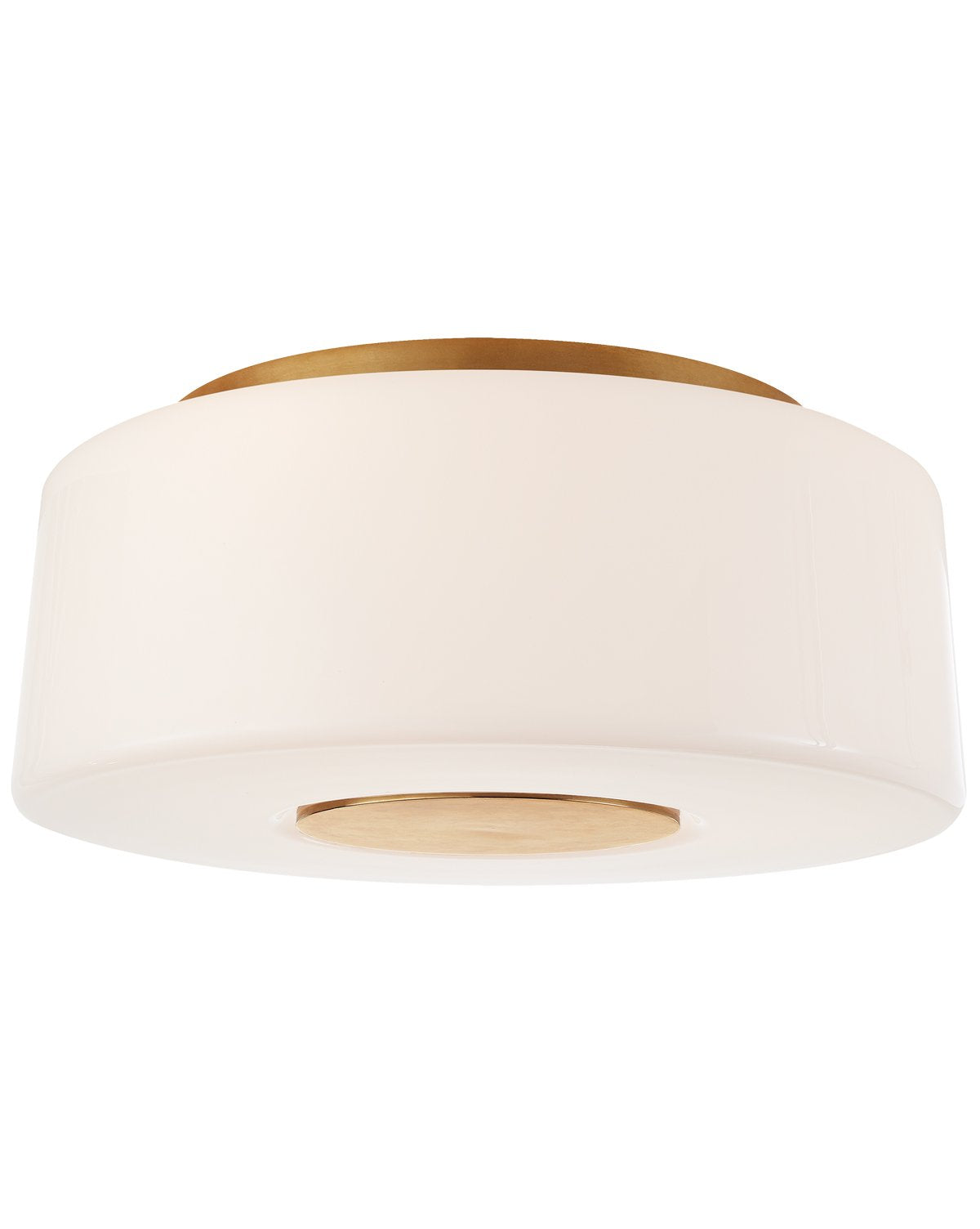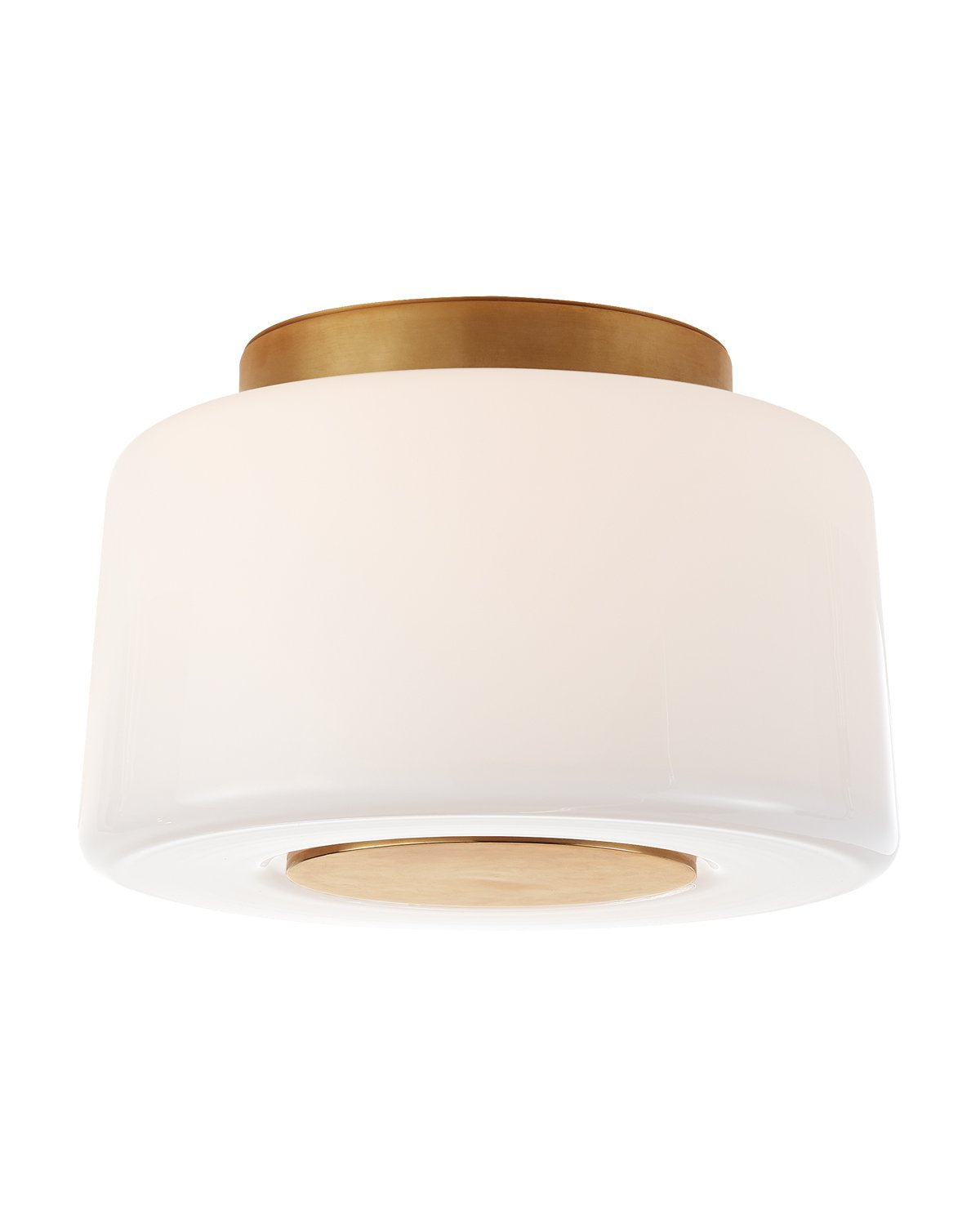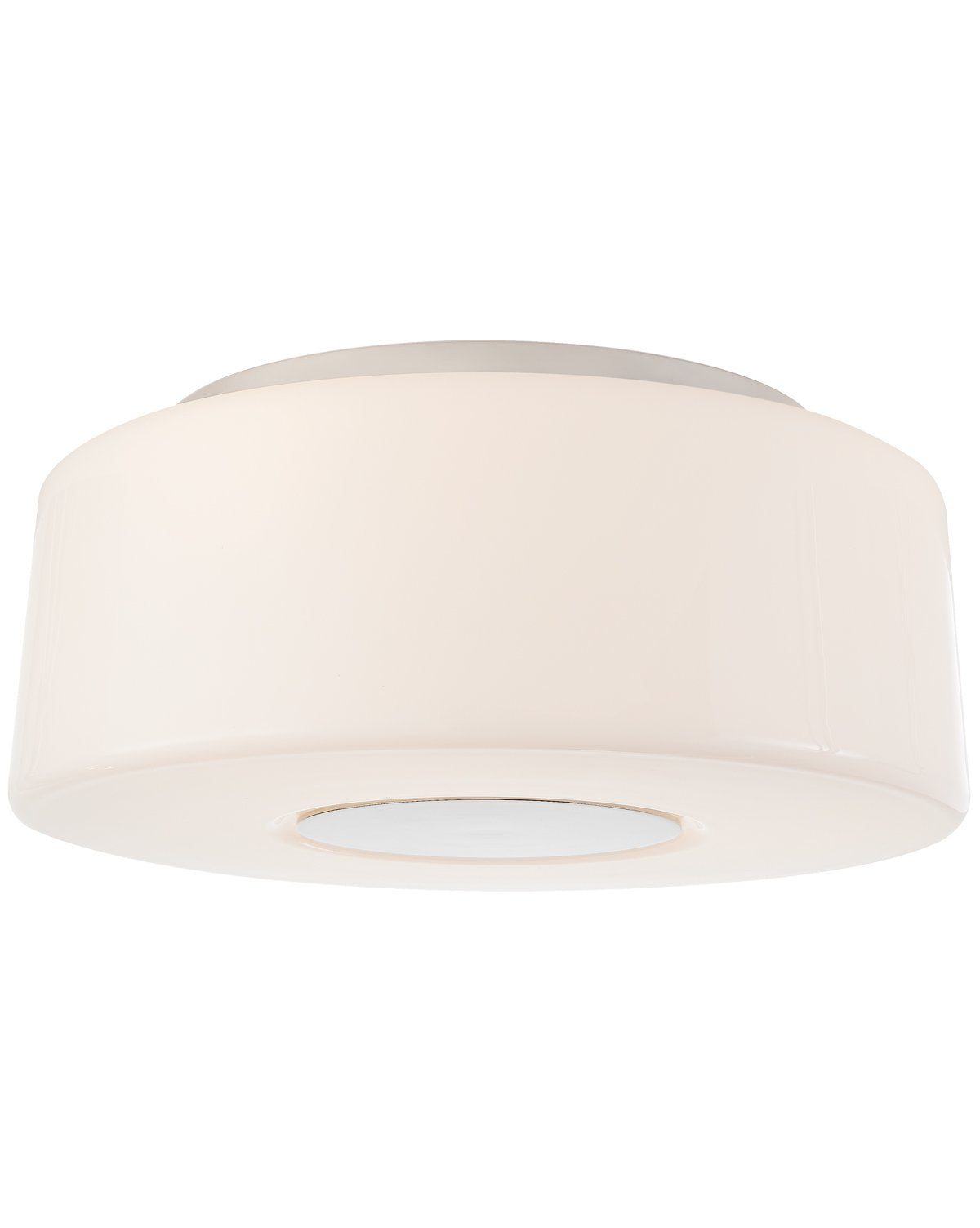 Simple and transitional, the clean silhouette of the Acme Flushmount will work in any home. The schoolhouse vibes of the white glass are contrasted by a metal plate accent in the finish of your choice.