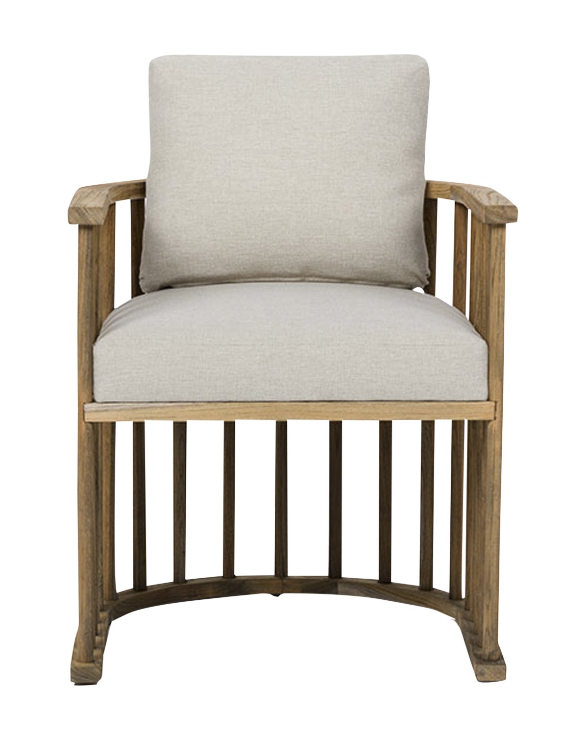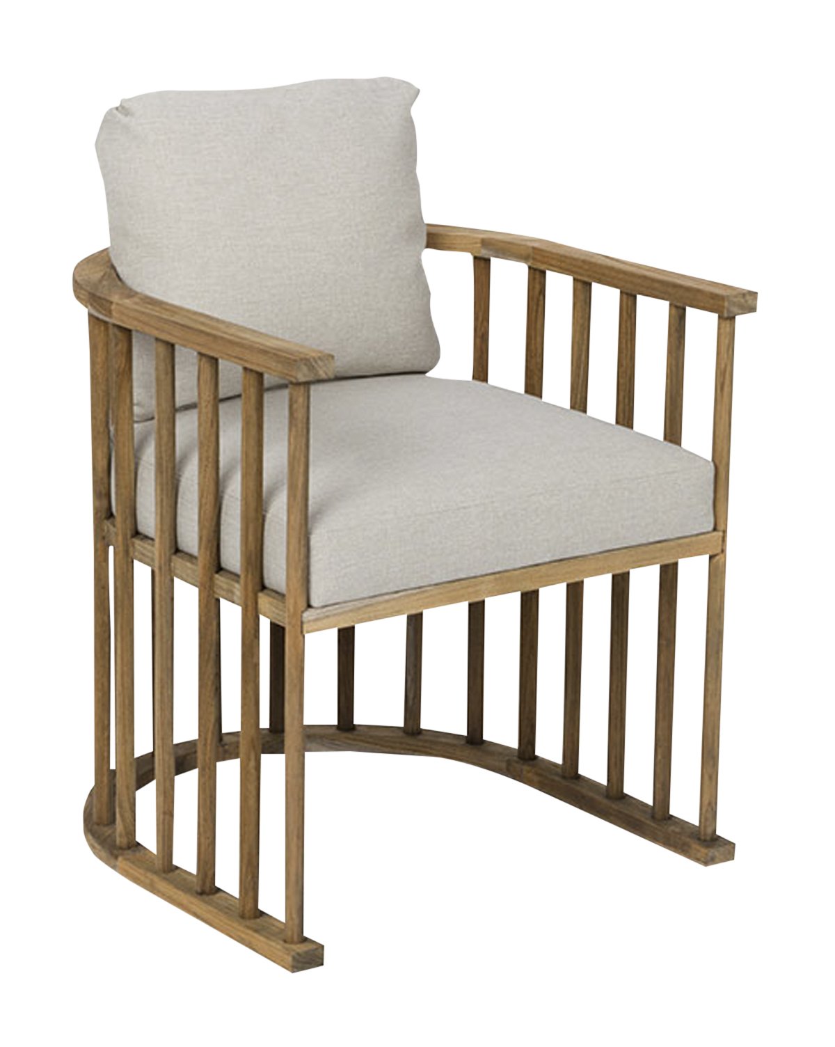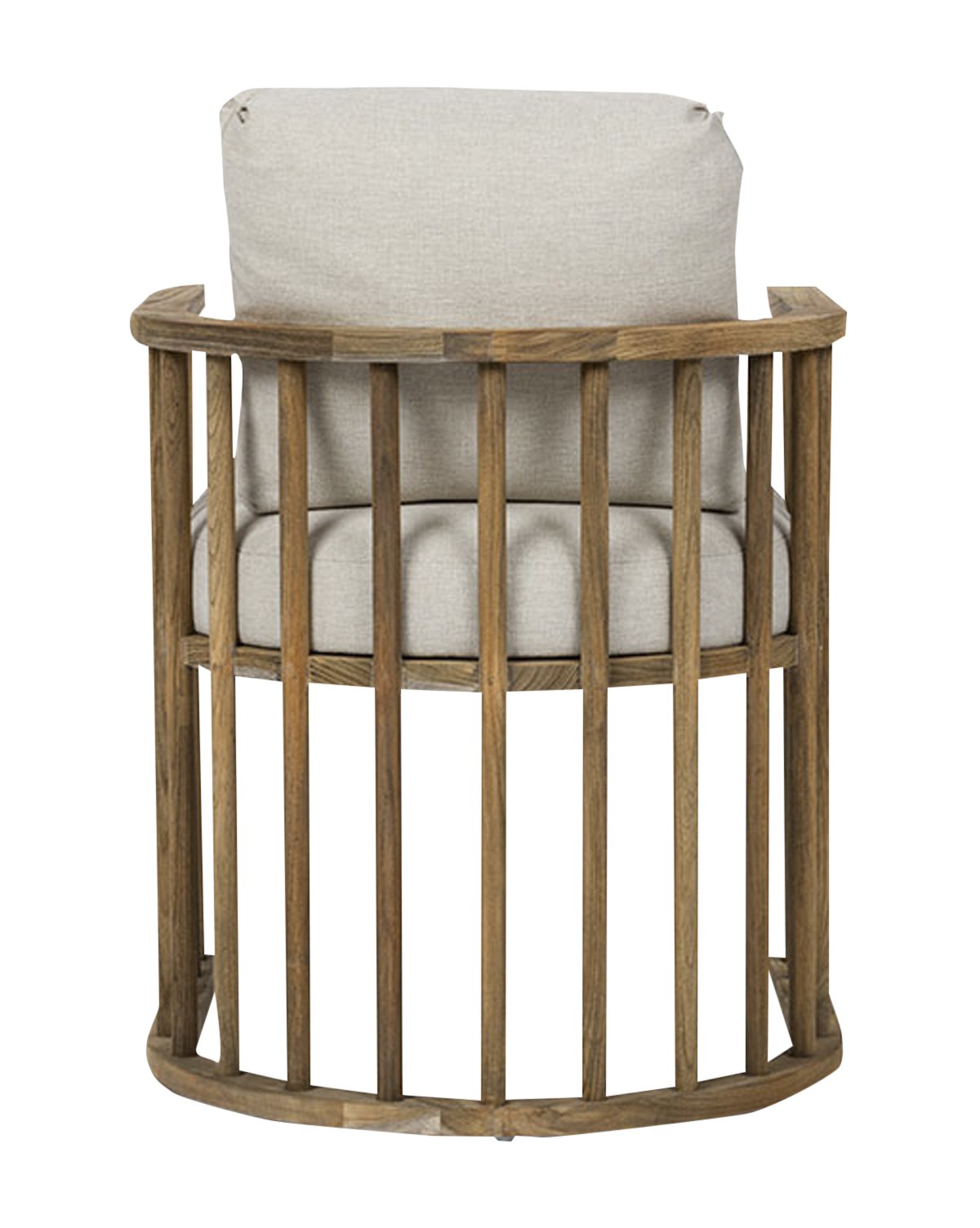 Giving a nod to 1940’s era tub chairs, the Aldrich Chair represents a modern refresh. A masterfully crafted teak frame, adds dimension with its smooth railed structure. Finished with a luxury cushion, this chair is the perfect statement piece in dining or living spaces.