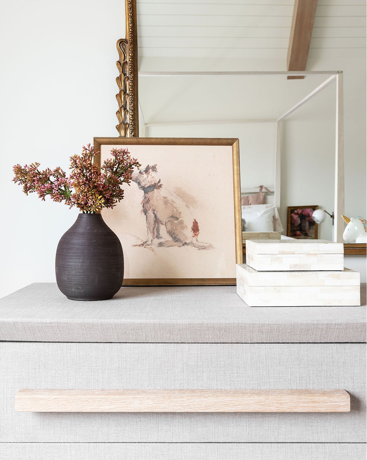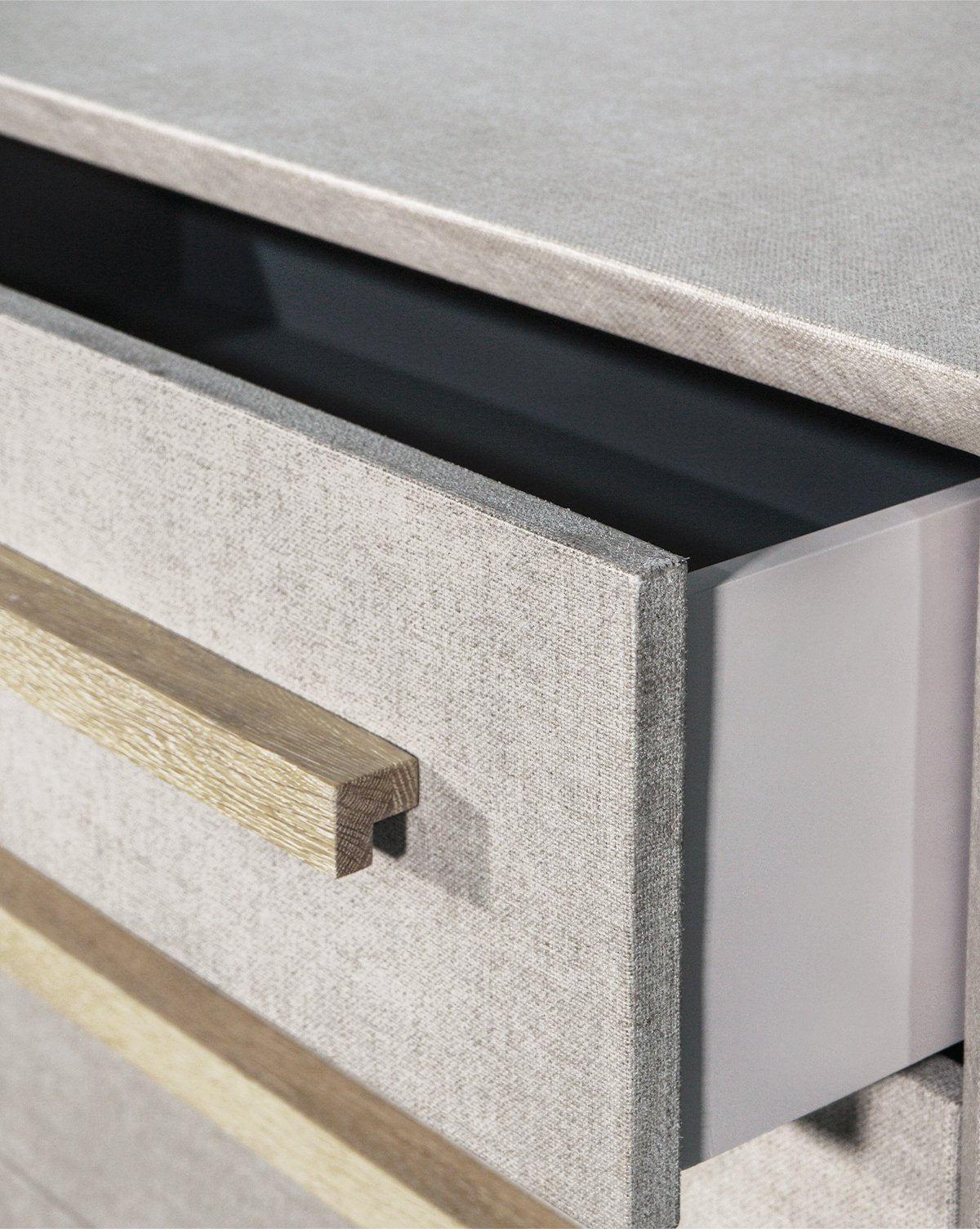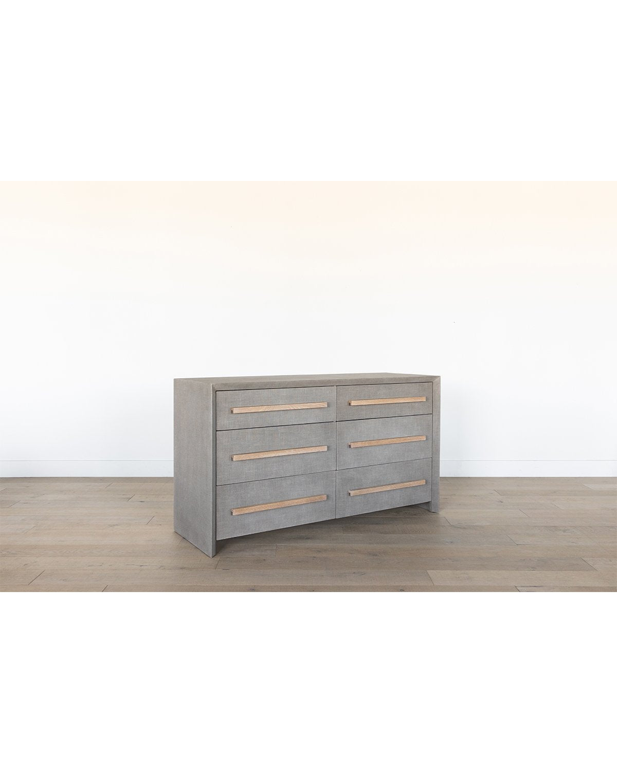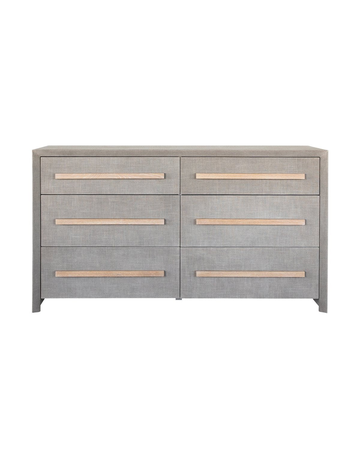 With a streamlined shape, the Alto Dresser brings both function and form to your bedroom design. A unique waterfall edge is wrapped in soft gray linen, coated for protection. From the airy hue to the gray wooden handles, watch as this dresser transforms your space with its subtle, unique texture.