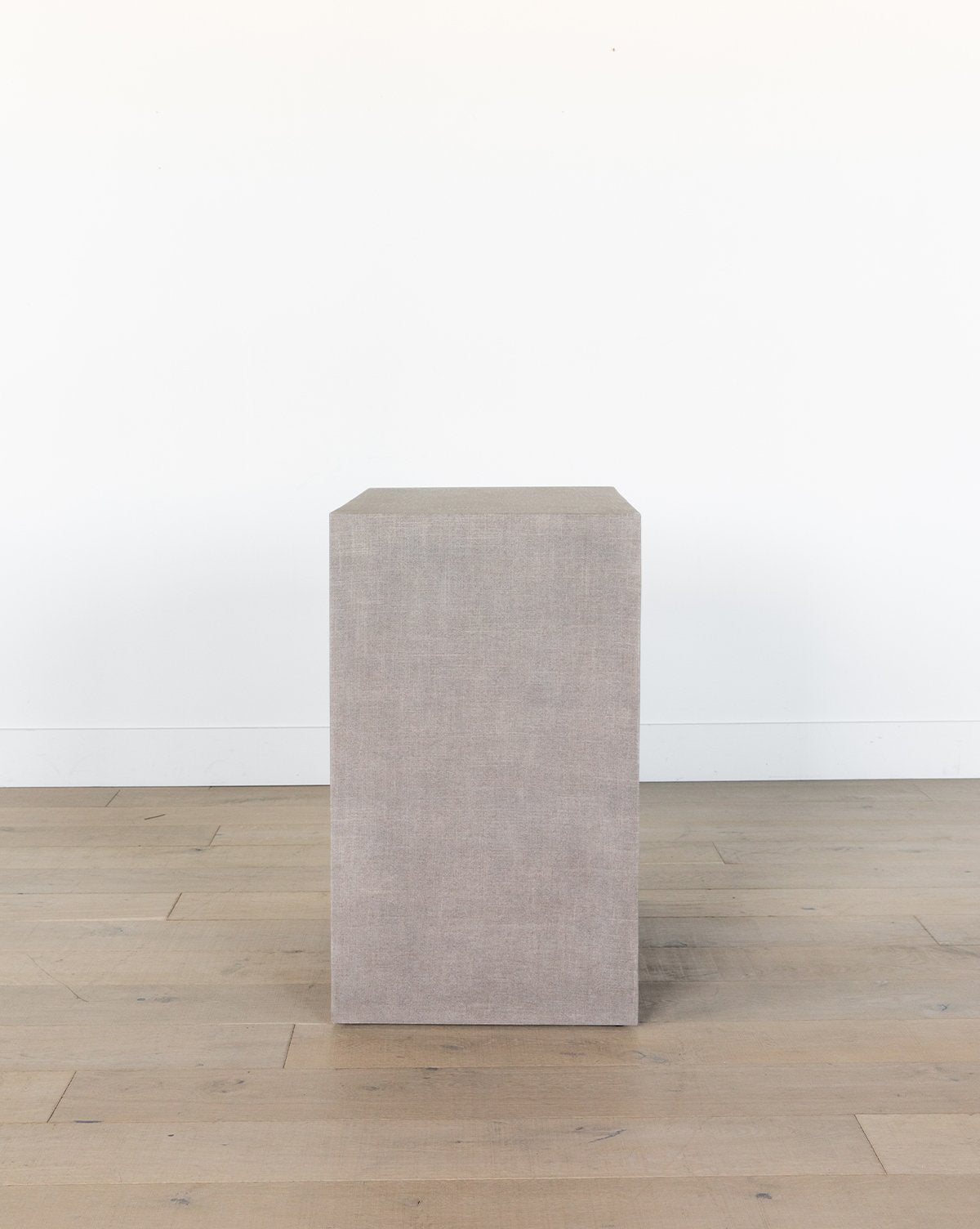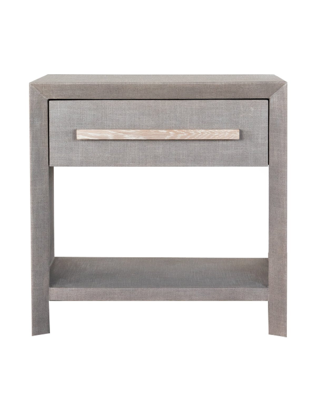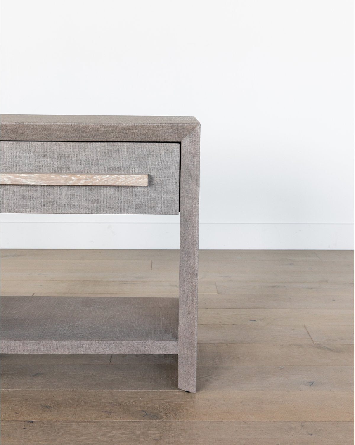 With a streamlined shape, the Alto Nightstand brings both function and form to your bedroom design. A unique waterfall edge is wrapped in soft gray linen, coated for protection. From the airy hue to the gray wooden handles, watch as this nightstand transforms your space with its subtle, unique texture.
