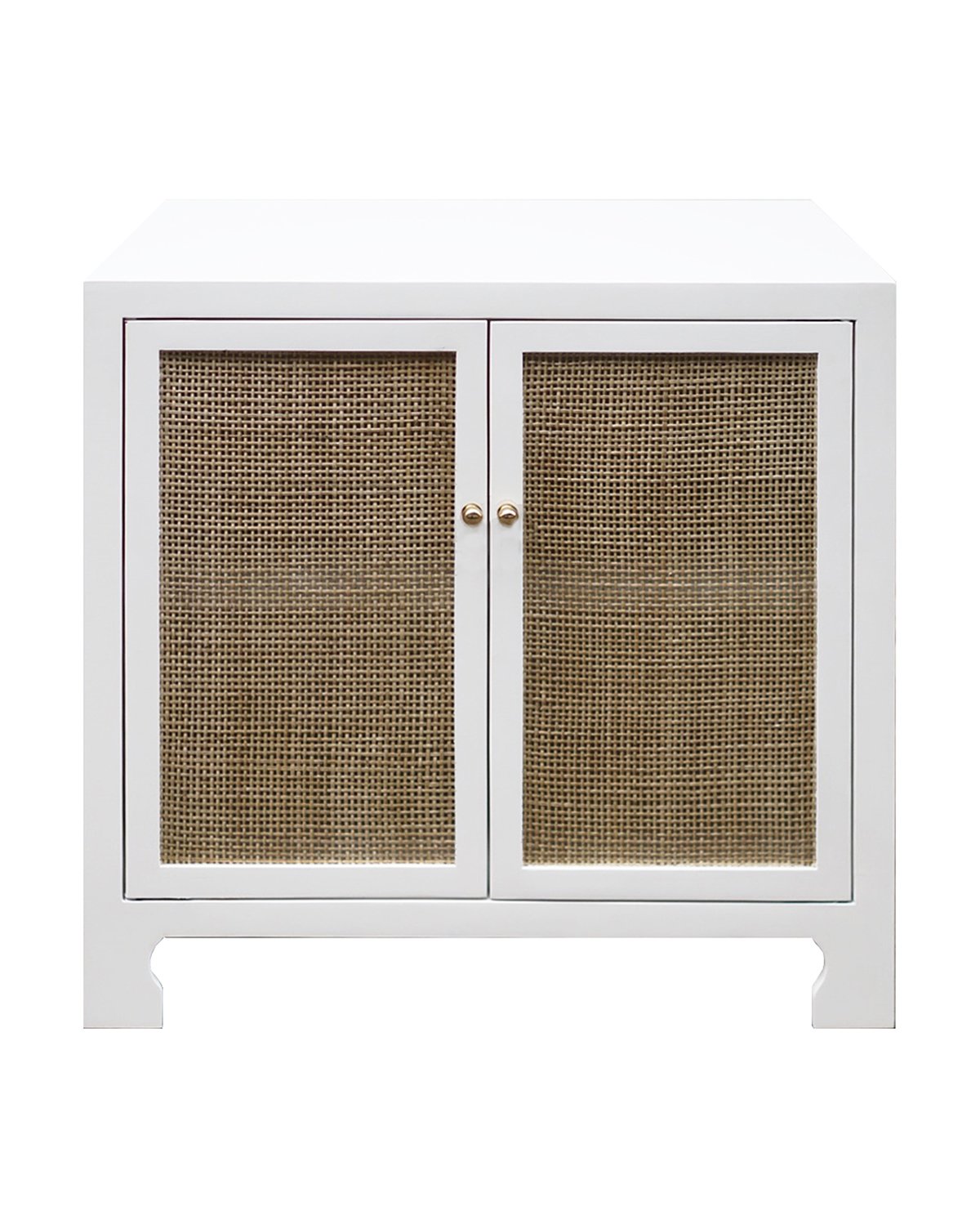 Traditional rattan cane doors give textural depth to the Amity Nightstand’s polished white lacquer frame. Its versatile color palette and ample storage space makes it an easy addition to any bedside vignette.