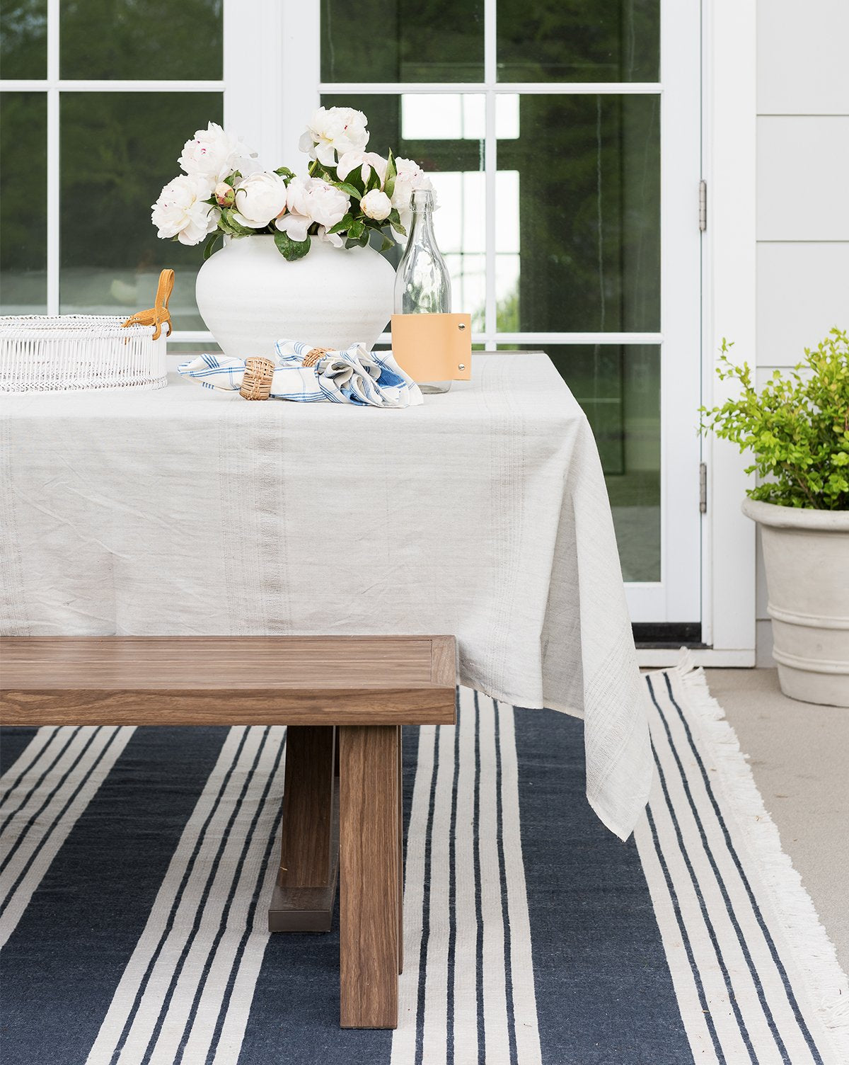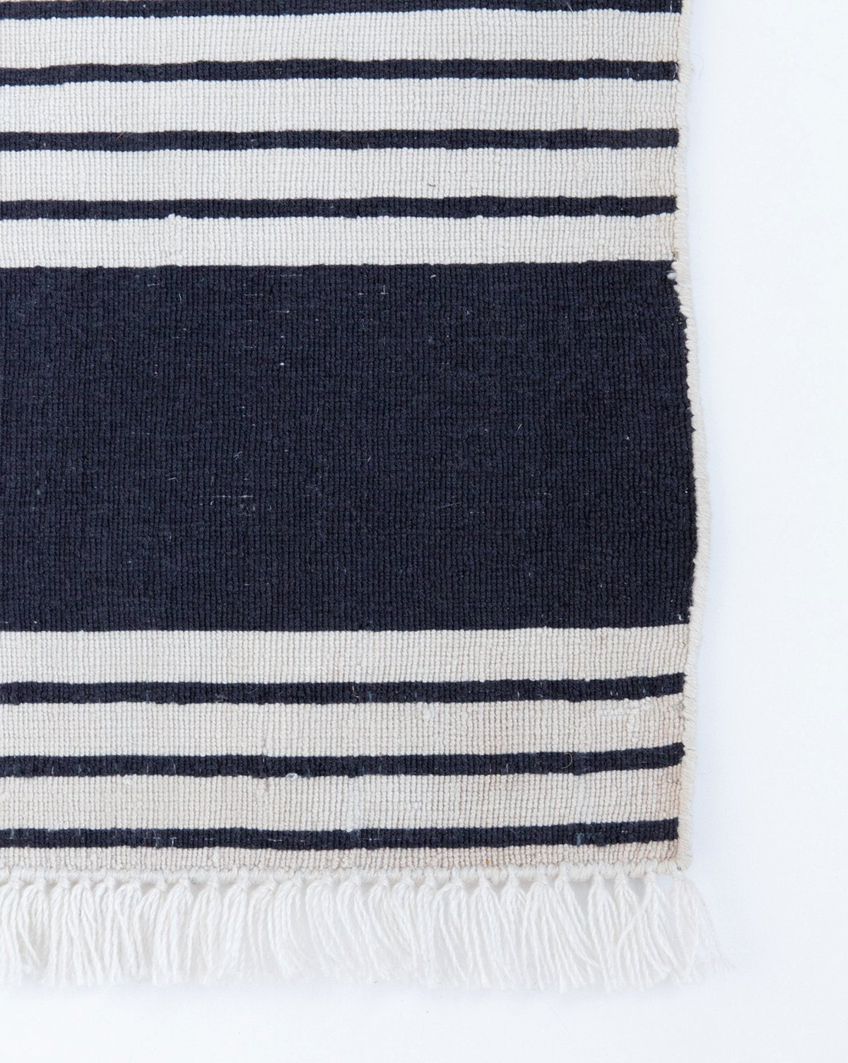 Handmade in India from recycled materials by skilled artisans, our Arbor rug is crafted to withstand the outdoor elements and the trends. Through a unique process, plastic bottles are recompositioned into yarn and hand-woven, creating this highly sustainable and durable rug that feels like cotton and remains timeless. Anchor your outdoor space with its simple striped pattern and weatherproof design.