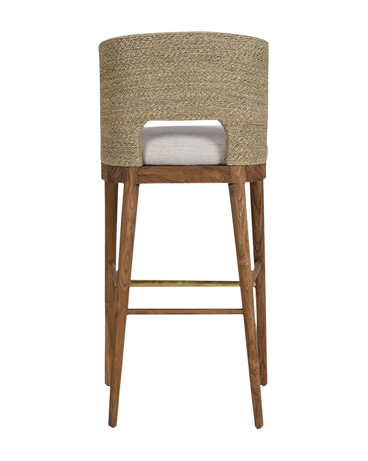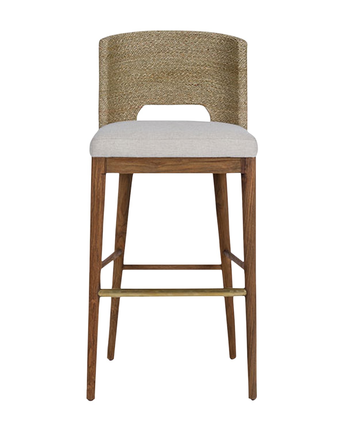 The natural material mix of the Ava Counter Stool not only elevates its design but adds casual approachability. The hand-woven seagrass back is bent into shape and fitted with a sandblasted teak frame. An upholstered, beach colored crypton fabric seat and brass footrest complete its design.