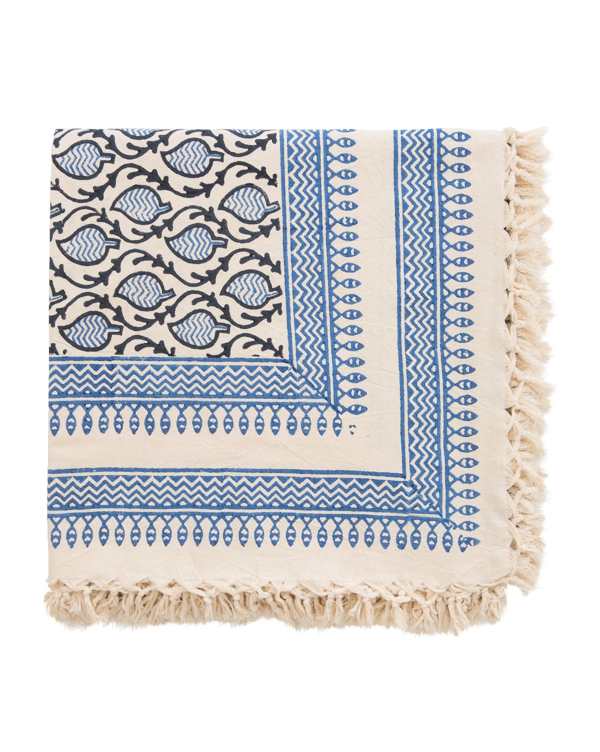 Handmade by skilled artisans in India, this tablecloth undergoes a unique hand block printing process. Carved designs on individual wooden blocks are dipped into dye, then stamped onto 100% cotton fabric, creating its contemporary motif. Finished with hand-knotted tassels, this patterned tablecloth lends plenty of visual interest, perfect for entertaining indoors or out.