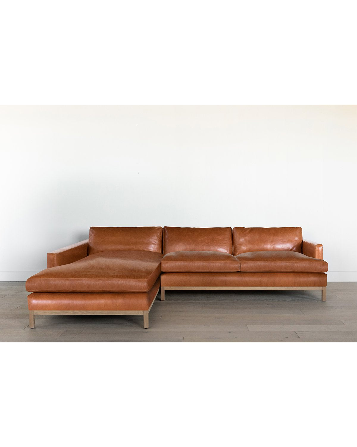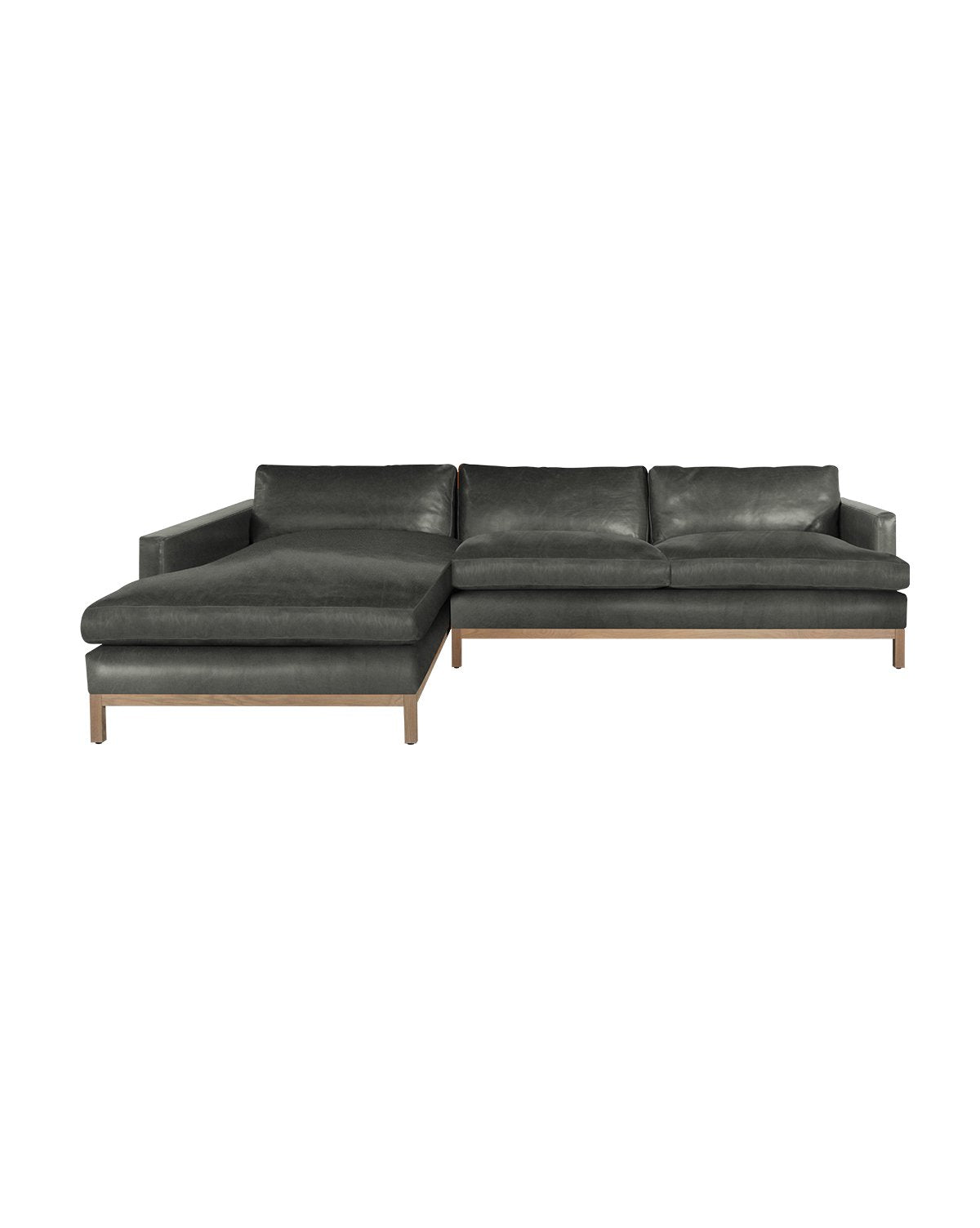 Modern style meets comfort with our streamlined Buckley Leather Sectional. Each cushion is wrapped in hand-stitched leather and dyed through an aniline process to retain the natural integrity of the hide. Its sleek white oak wood frame is proven by a kiln-dried process for both quality and durability. Offered in two supple leathers and crafted to last throughout the years, its leather construction only gets better with age.
