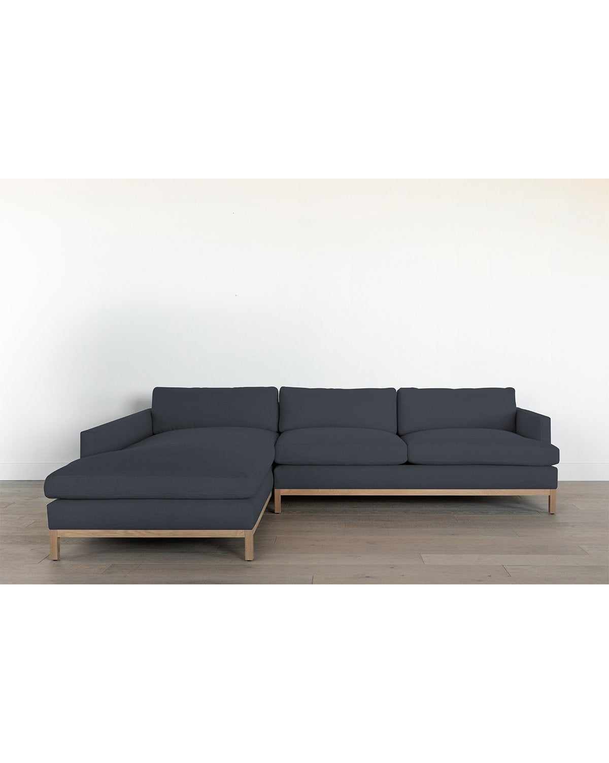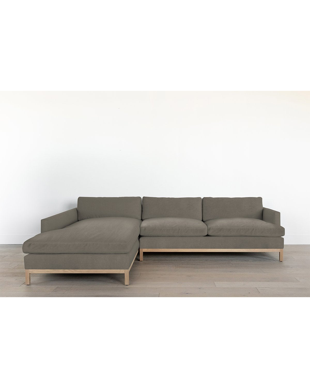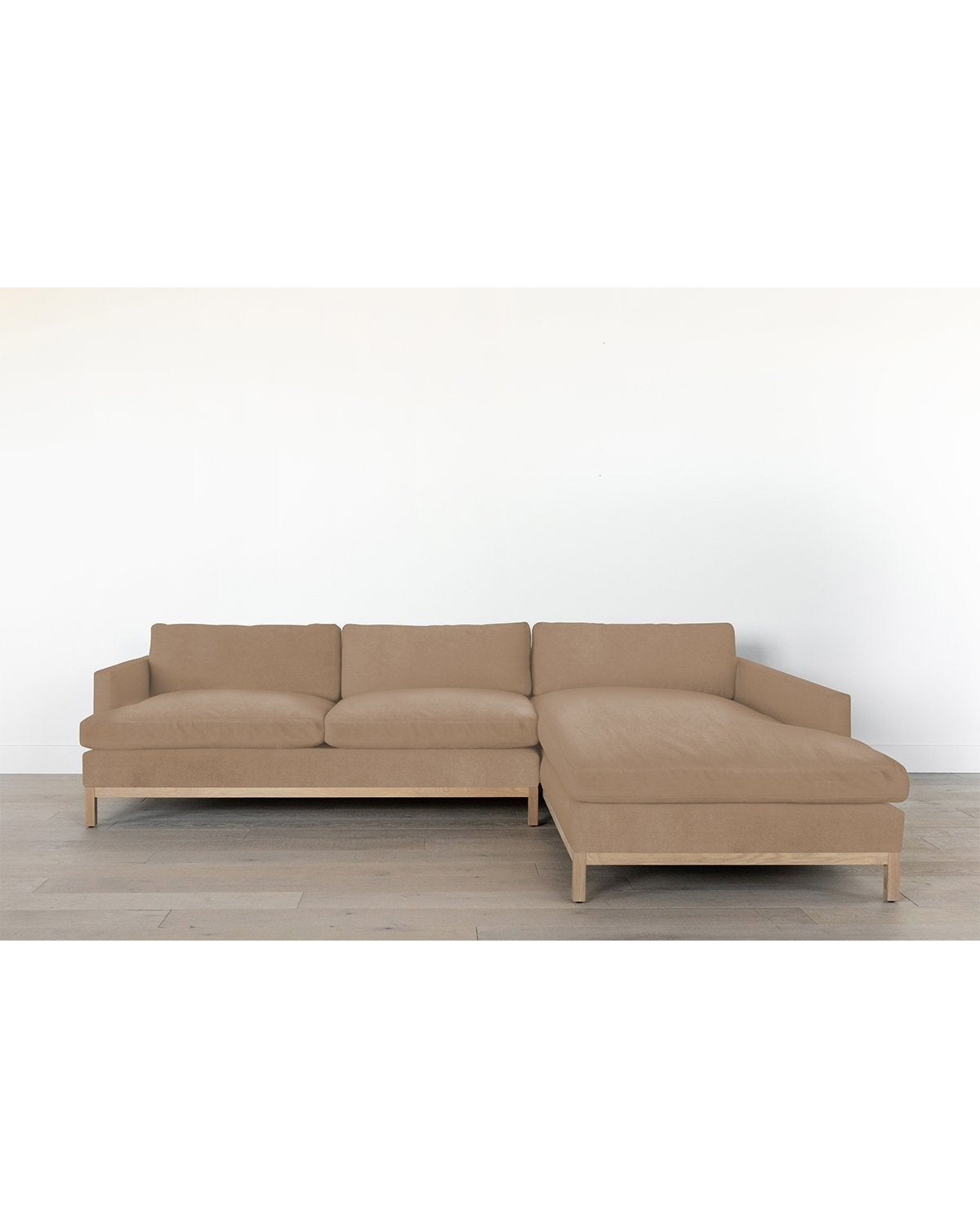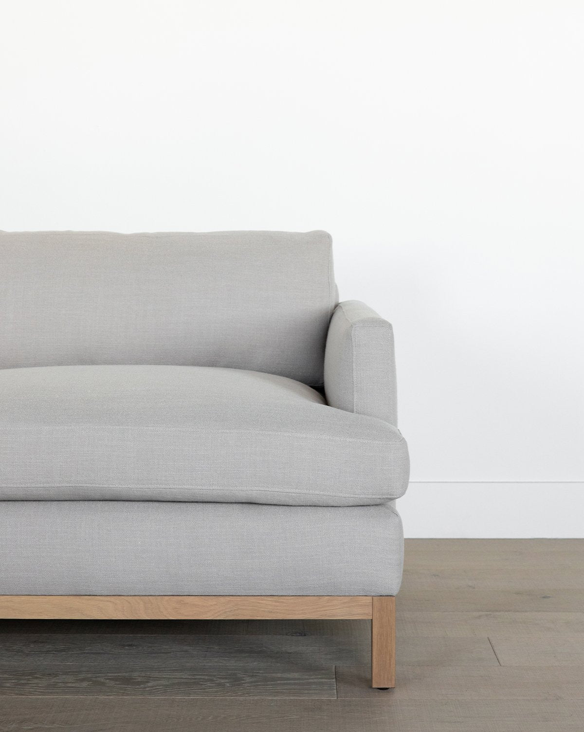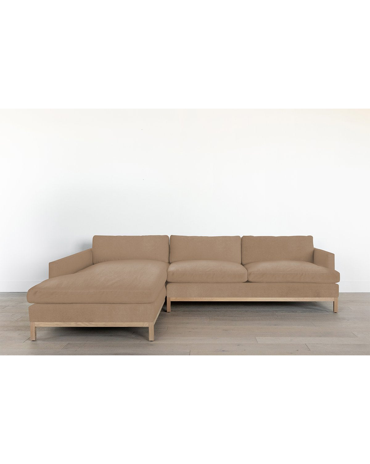 Modern style meets comfort with our streamlined Buckley Leather Sectional. Completely customizable, this sectional comes in varying fabrics from soft velvet to performance crypton bringing additional style and versatility to your space. Its down wrapped cushions make for luxuriously soft seating, as a kiln-dried, white oak base provides durability and quality to last throughout the ages.