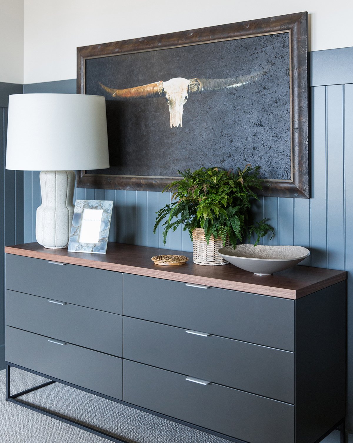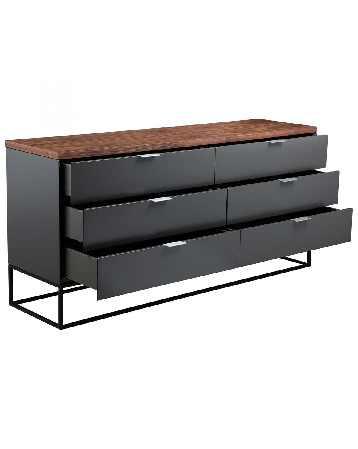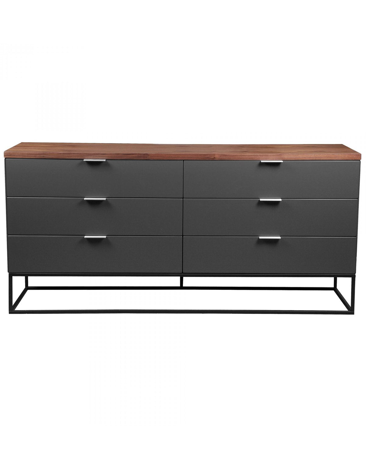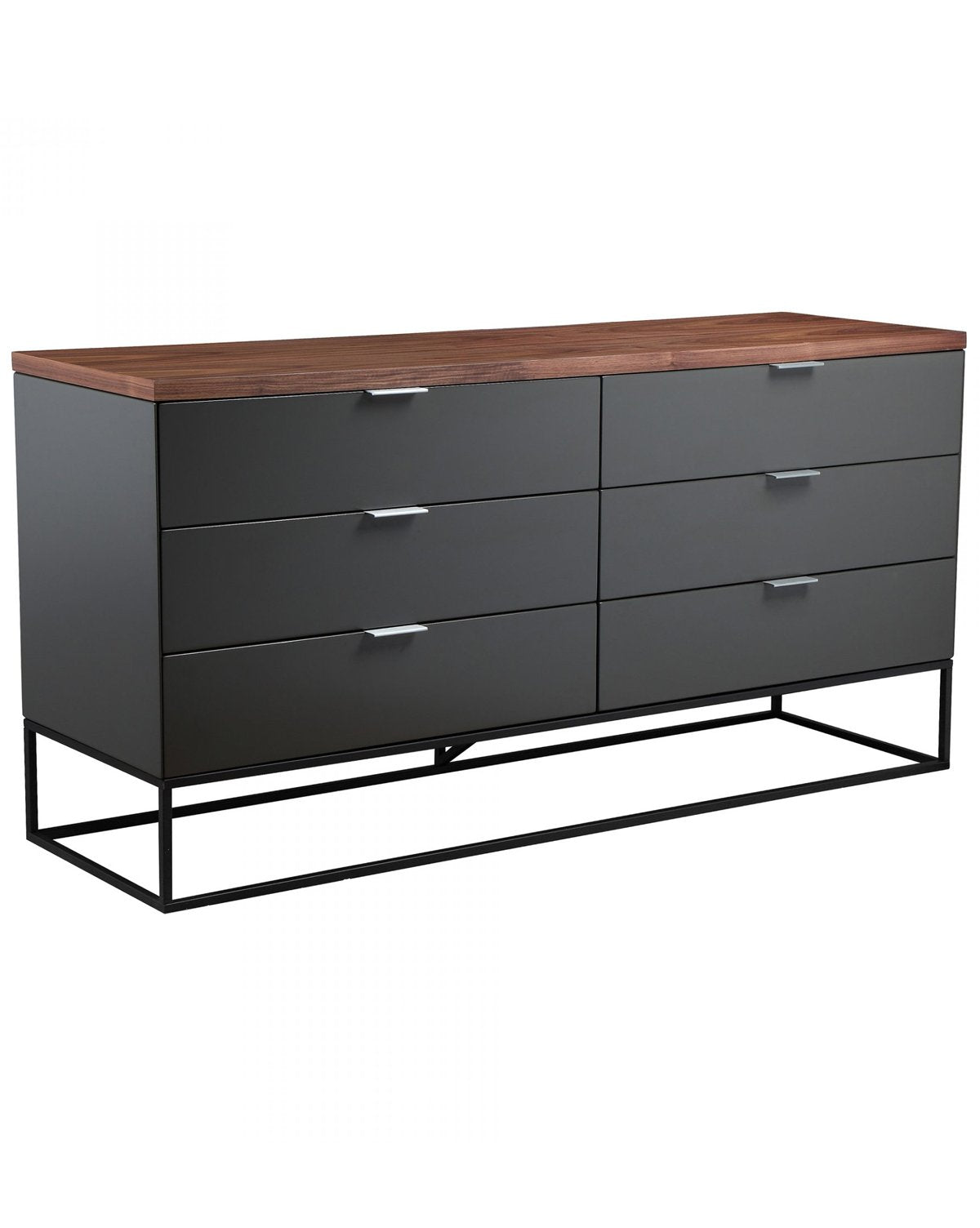 A rich material mix, the Christopher 6-Drawer Dresser features a walnut veneer top, gray-lacquer drawers, and a black metal base. Take advantage of its open-air base and clean lines to add a modern silhouette to your space.