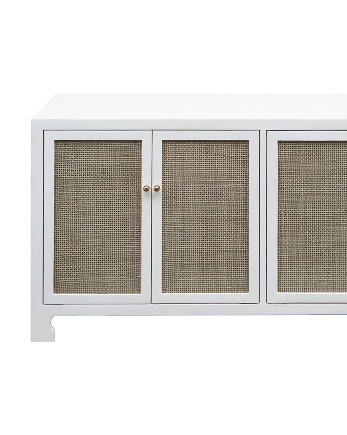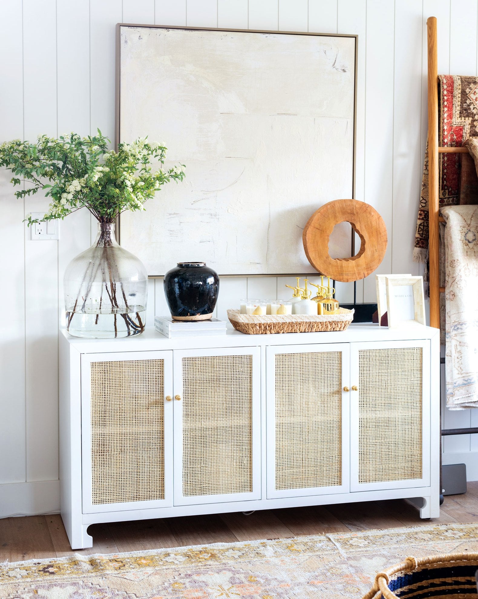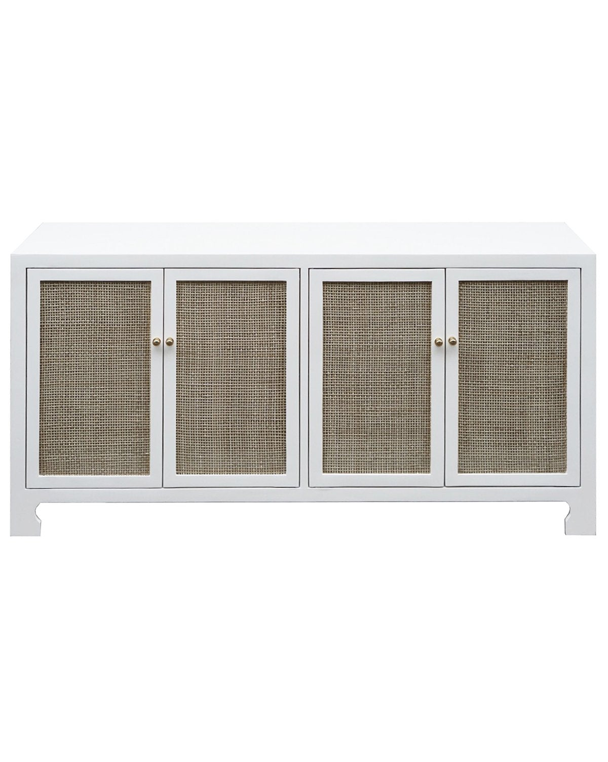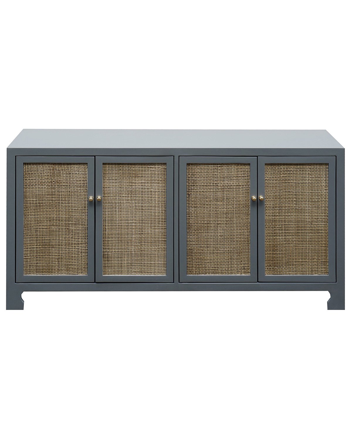 Rattan cane and lacquer are a material mix that works, and the Claire Cabinet display the best of both. Its cane cabinet doors add depth and textural contrast to both gray and white color lacquer finish options, while also providing hidden storage.
