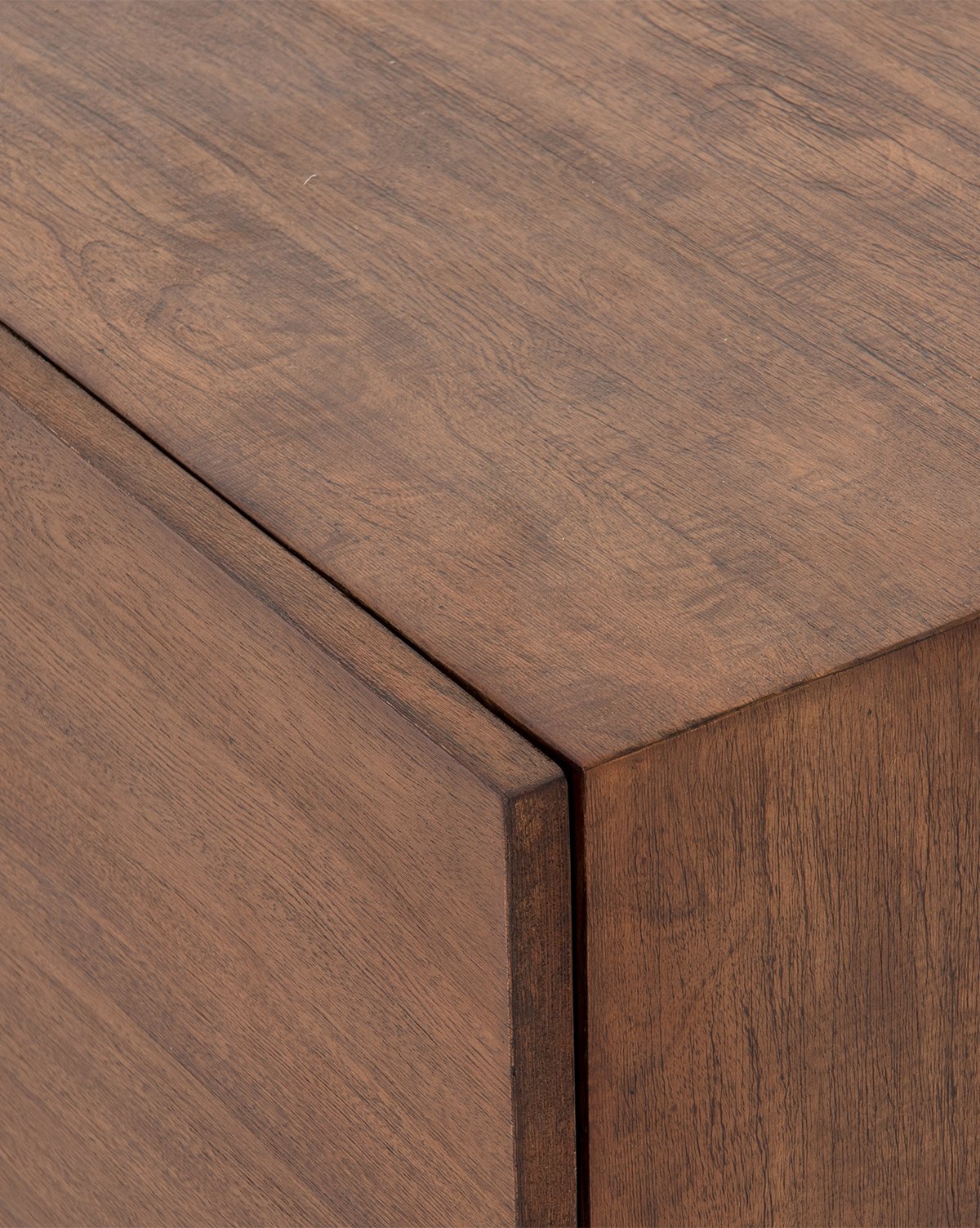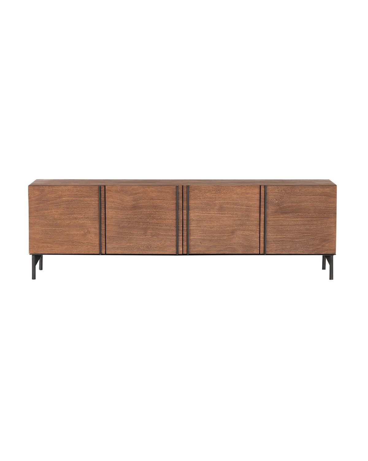 Shapely and minimalistic, our Dalia Sideboard is crafted from a stunning composition of iron and mango wood. Its slim iron legs create a float-like look, while complementing pulls of iron bring interest to its rich wood doors. Perfect for keeping cords out of sight, this console features rear cutouts and interior shelving for all your media needs.