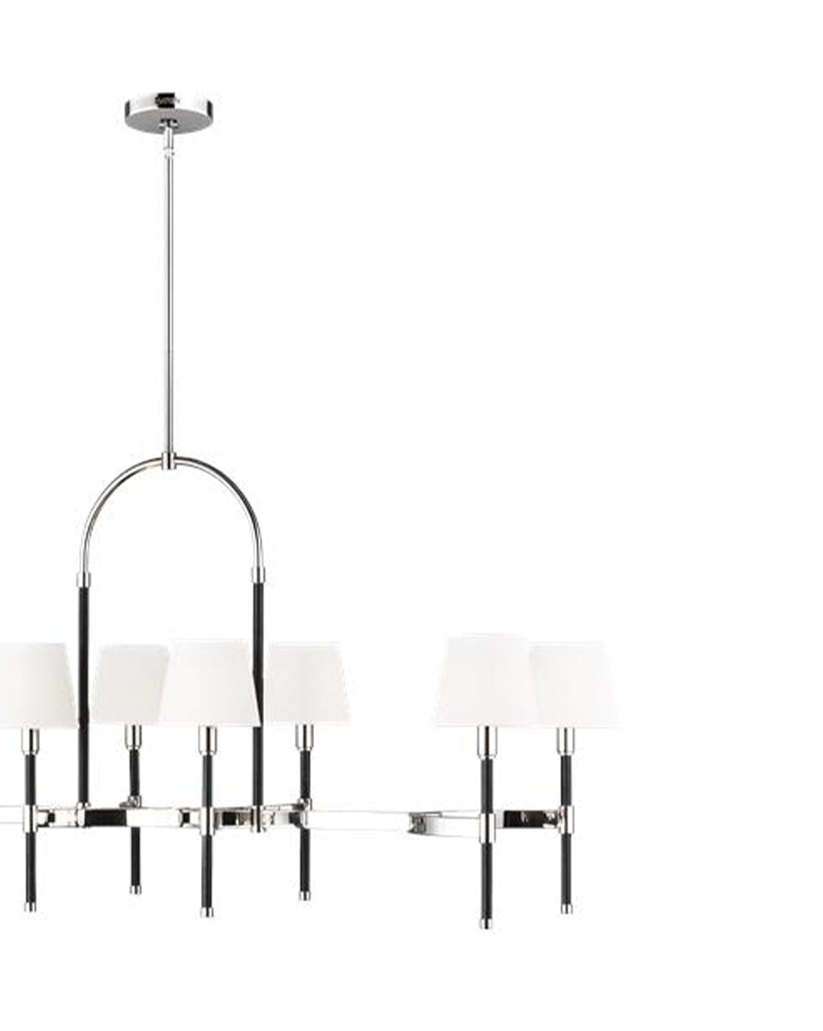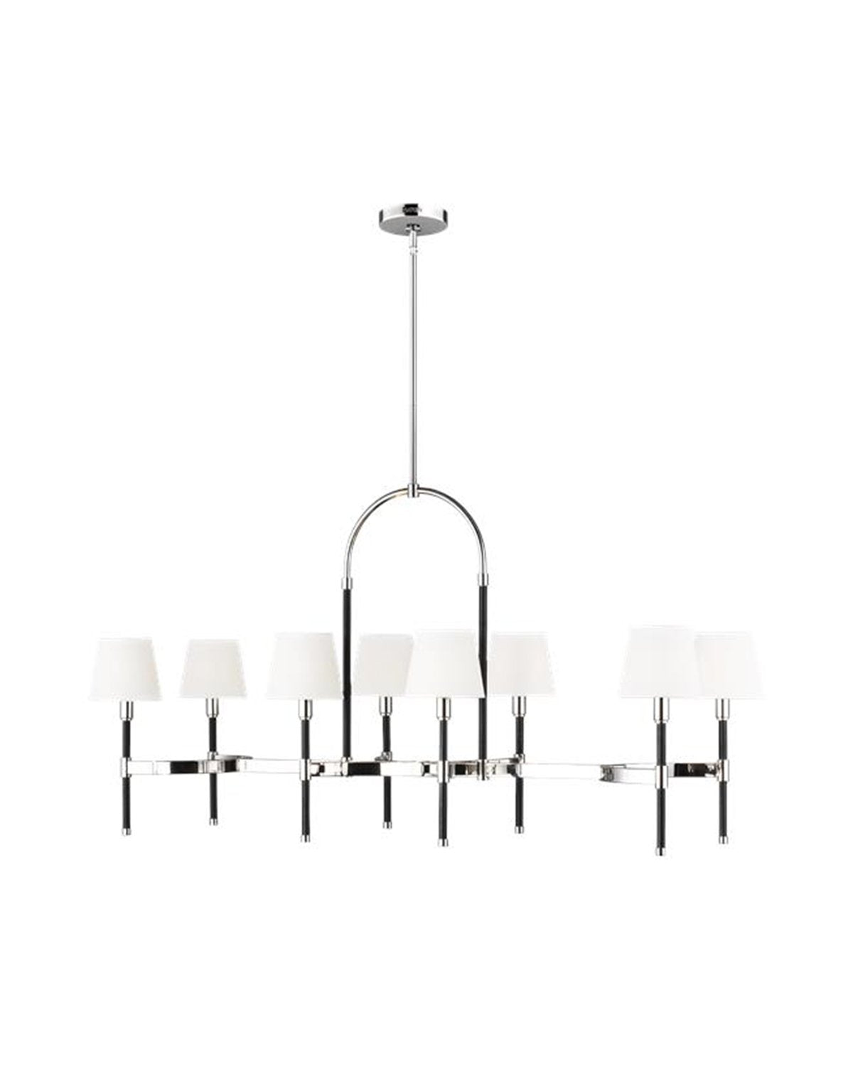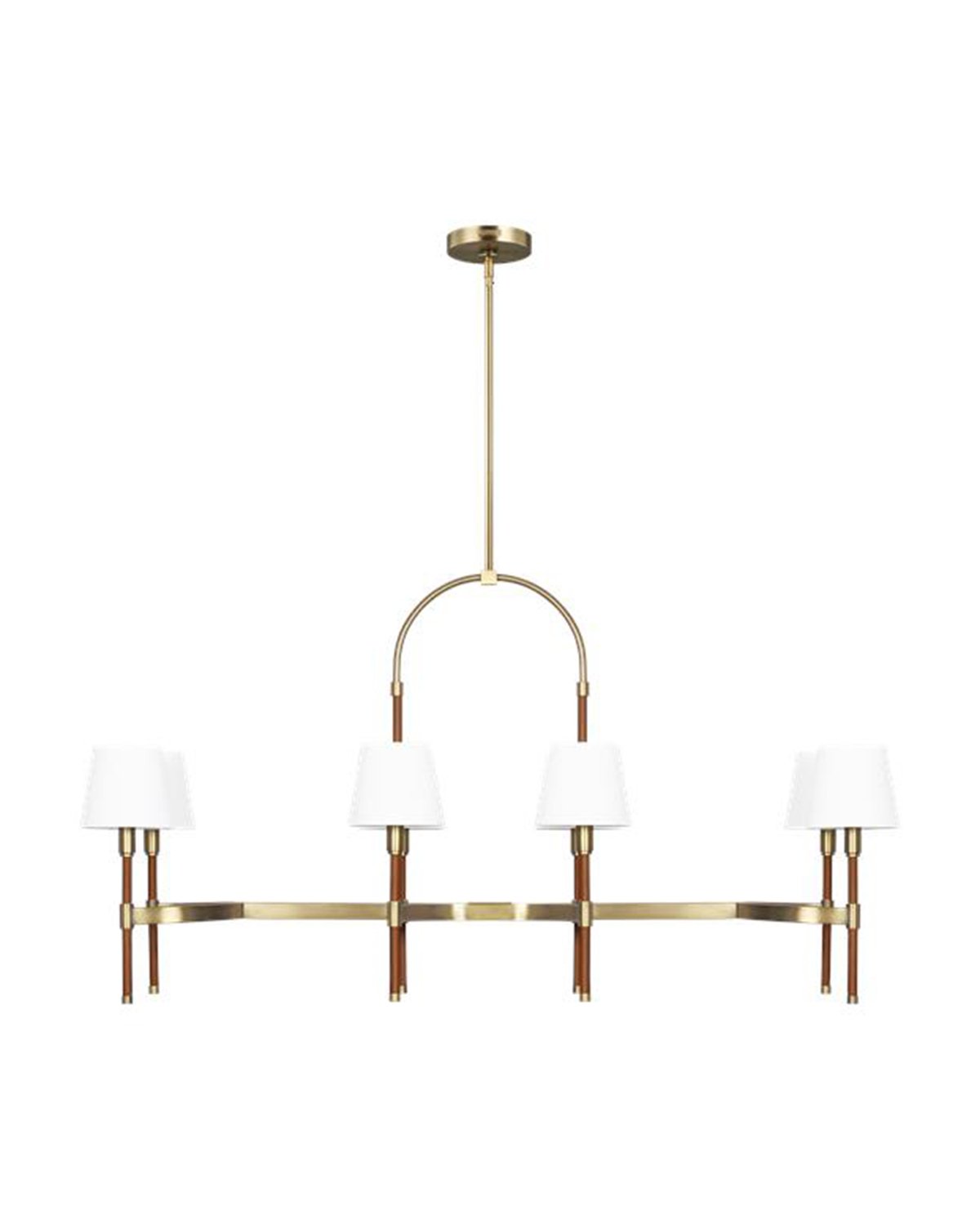 Mixed materials add a unique, refined element to the unusual shape of our Danica Linear Chandelier. With a base finished in either a time worn brass or polished nickel, leather details in a rich cognac or solid black accent the sophisticated silhouette, elevating your dining table or even kitchen island to a new level.