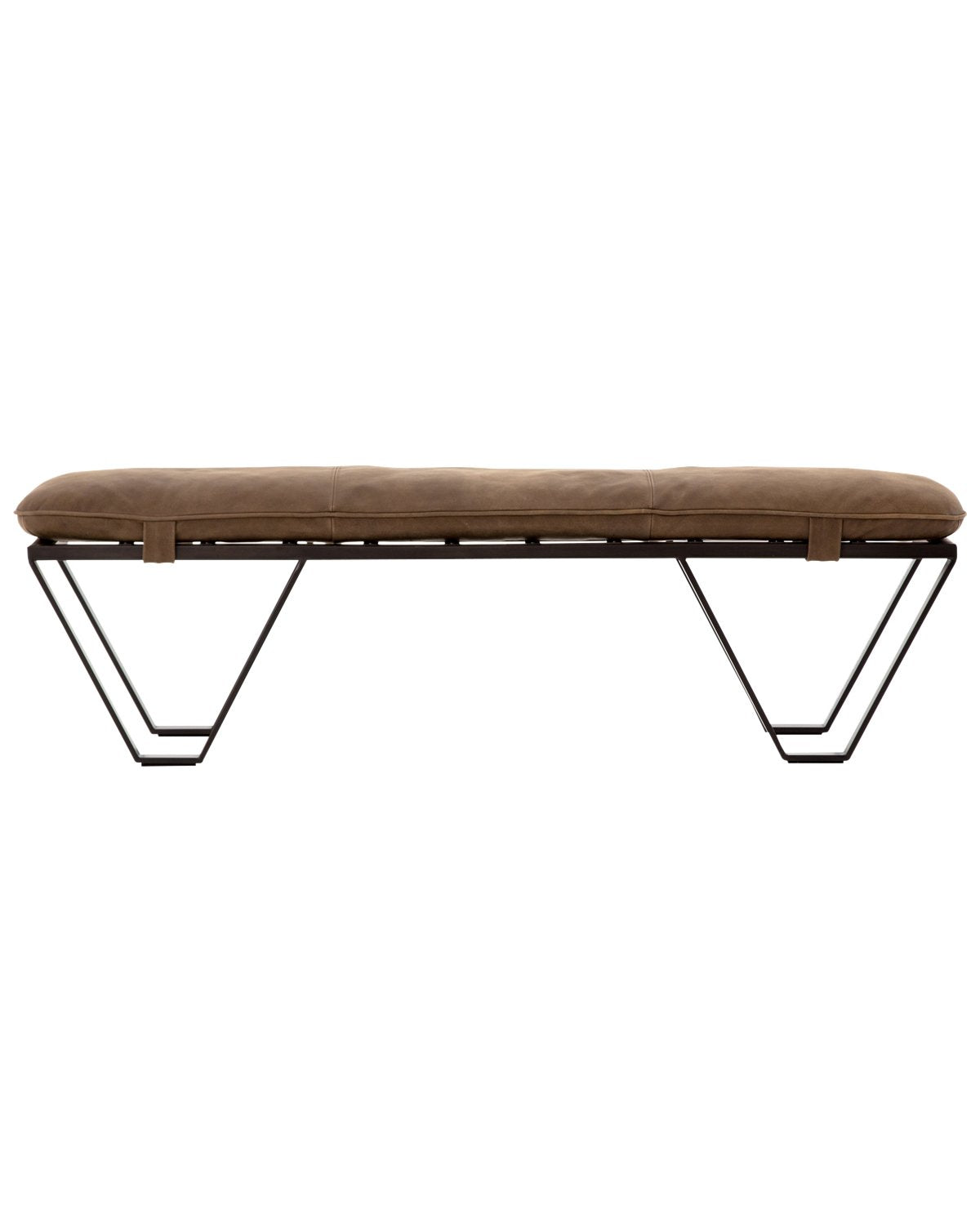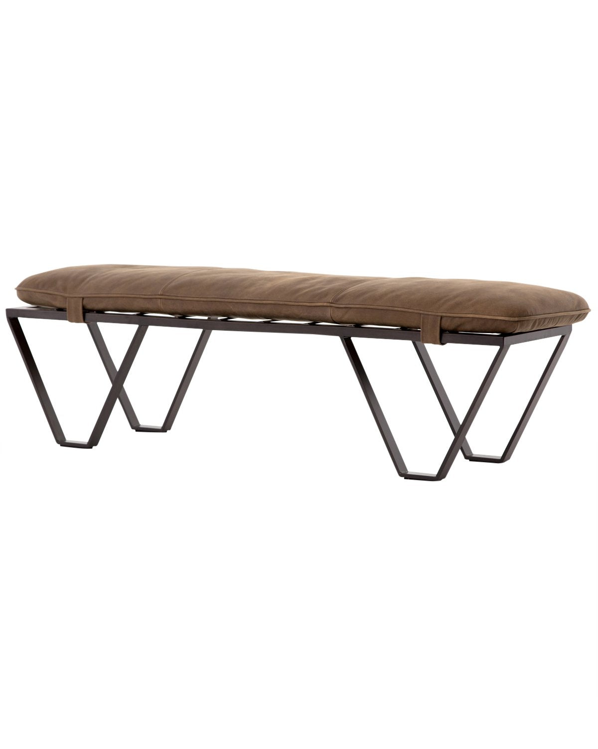 The geometric iron base with a strapped on top-grain leather seat has a great industrial feel that can hold its own anywhere you put it.