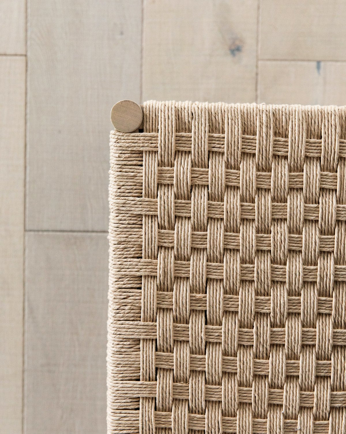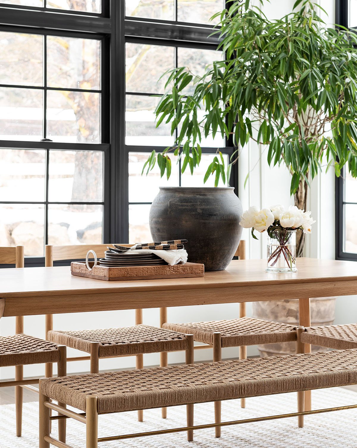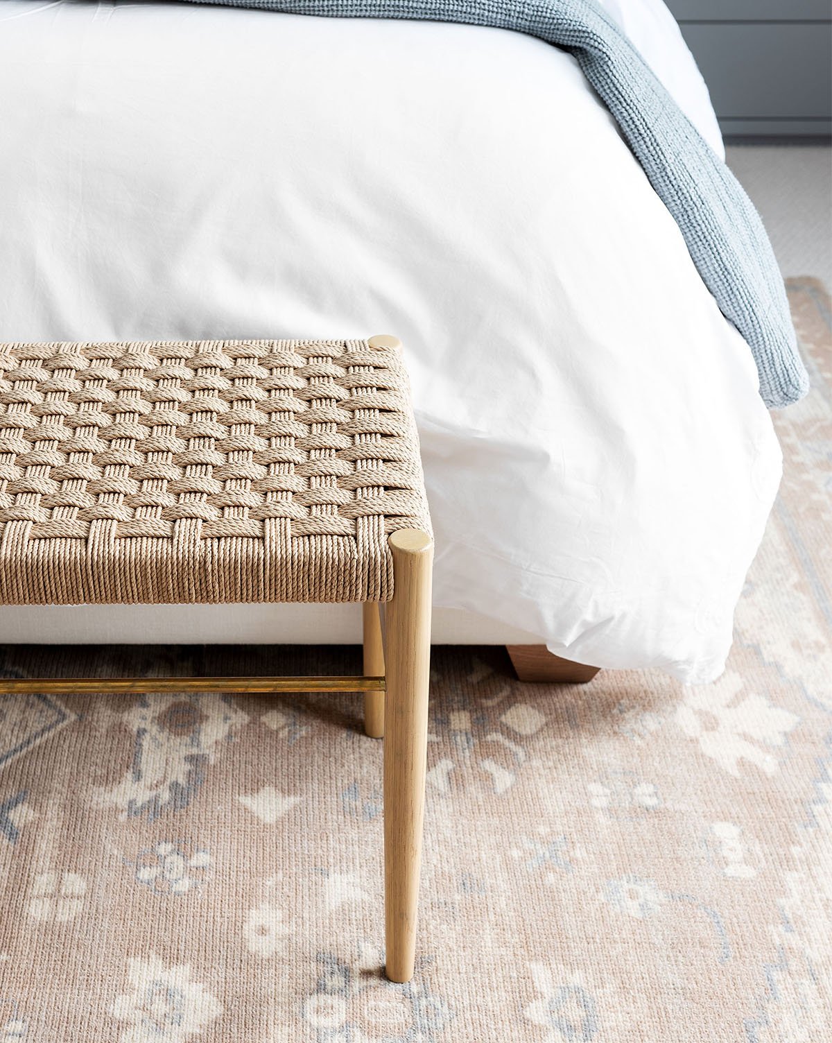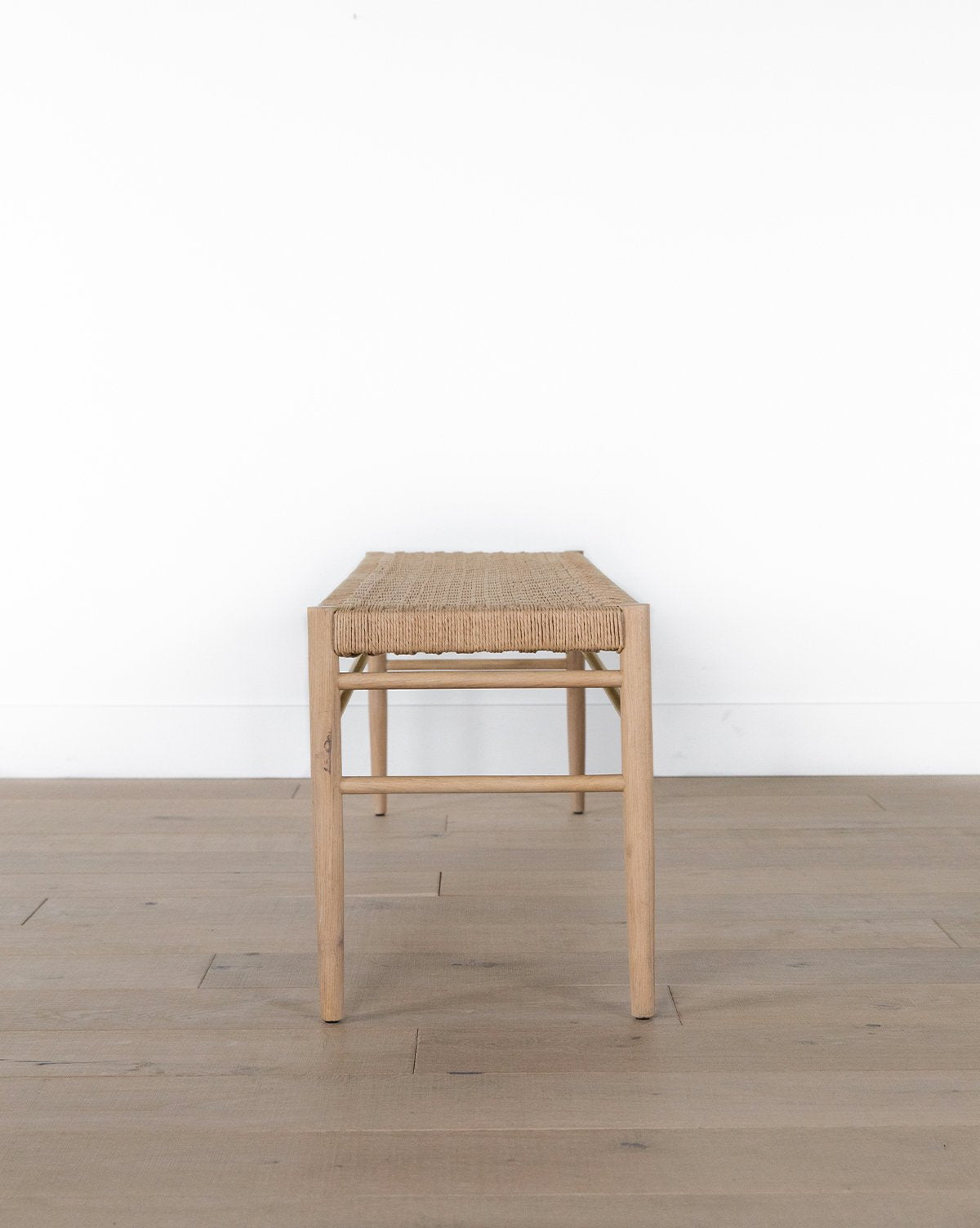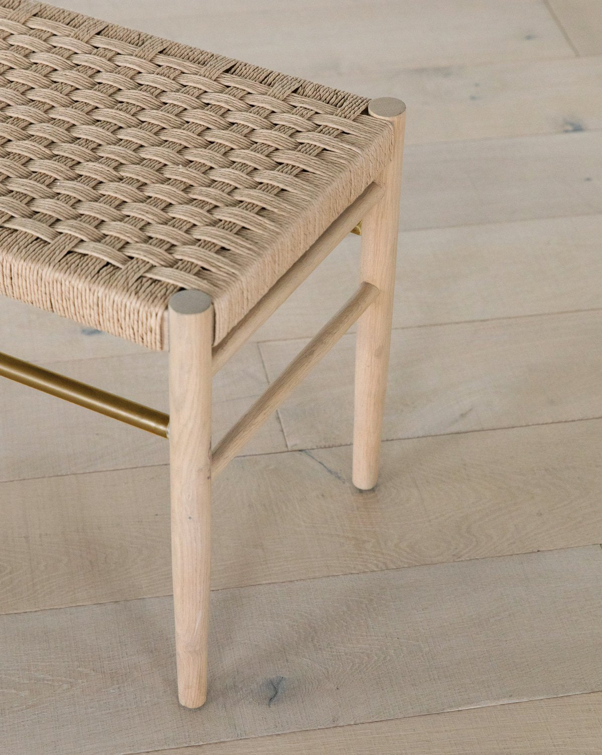 Simplistic and versatile, our Eloise Woven Bench is inspired by Danish design from the woven paper cord seat to the slightly tapered legs. Crafted as a transitional piece to blend seamlessly in an array of different design styles, its streamlined form gets a touch of added dimension with a refined brass bar detail. Place in your mudroom as a soft seat to take off your shoes, or simply styled as part of an entryway vignette, this bench is crafted from solid white oak, proven to stand the test of time.