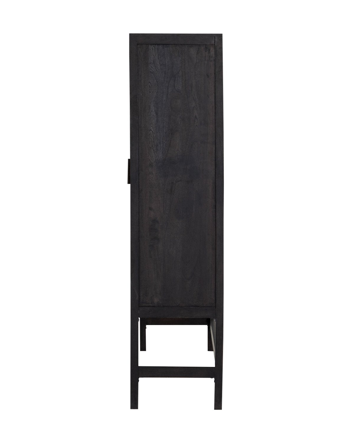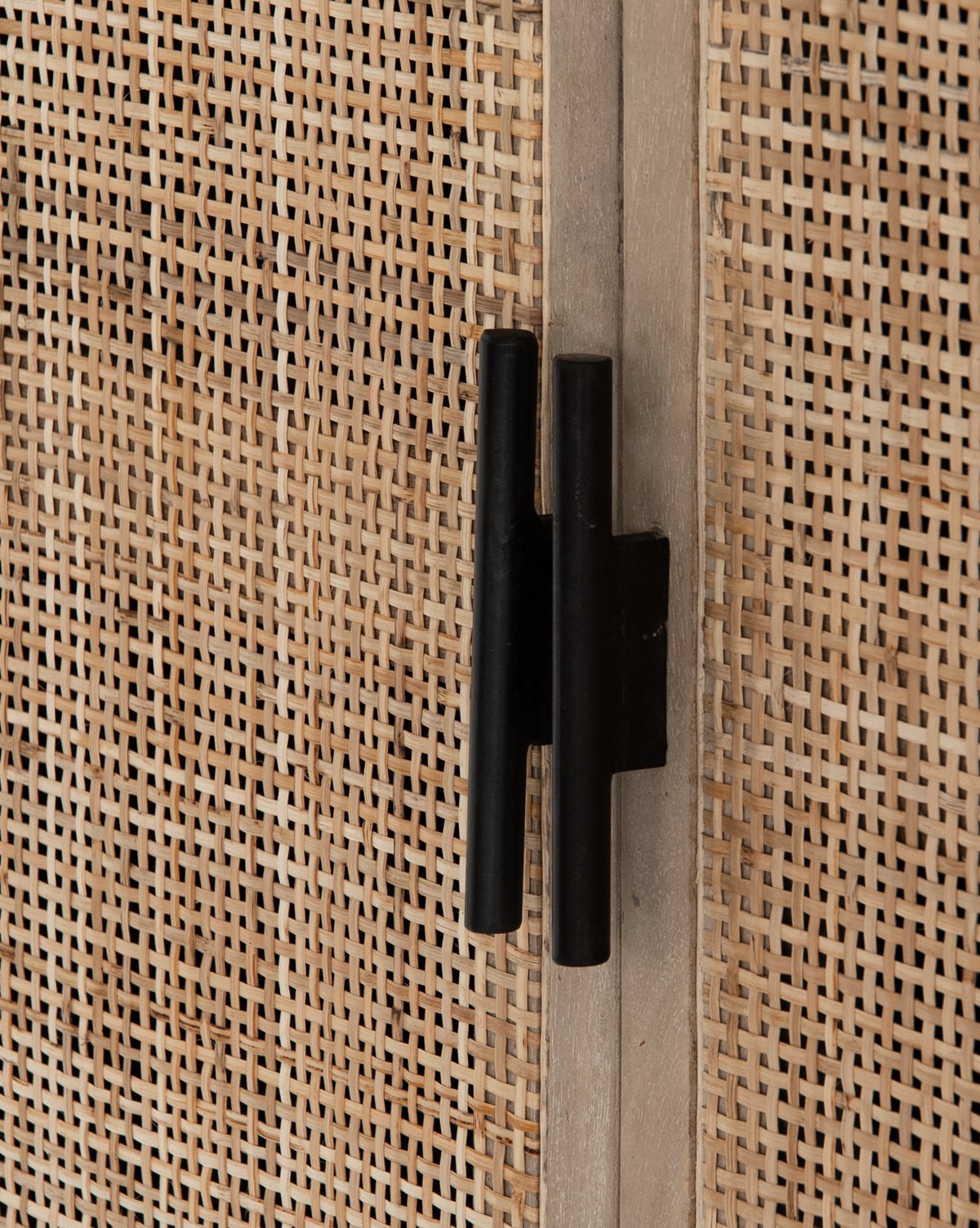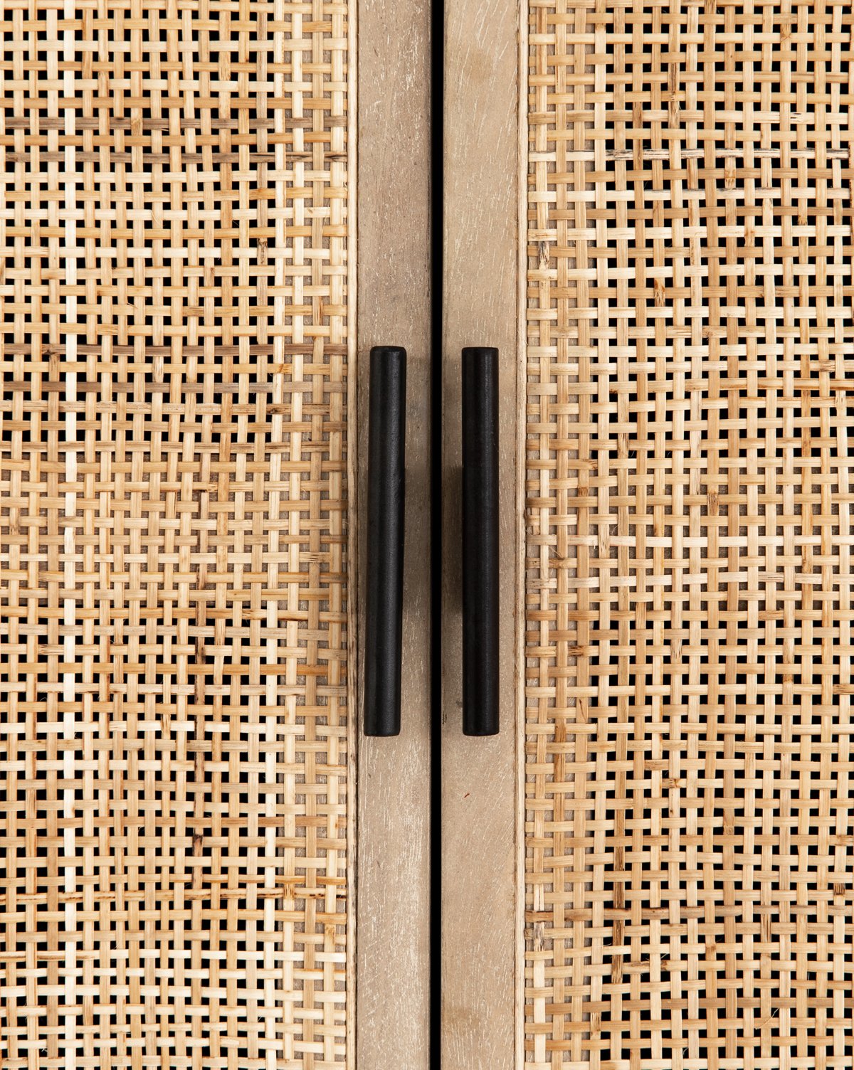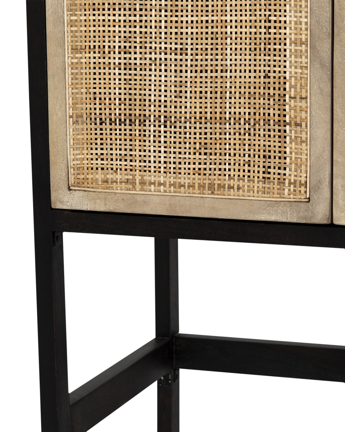 A unique two-tone contrast adds dimension and texture to the Fallon Cabinet. Shelving crafted from black acacia provides ample storage, while mango framed doors, woven with natural cane adds an eye-catching piece to your home design.