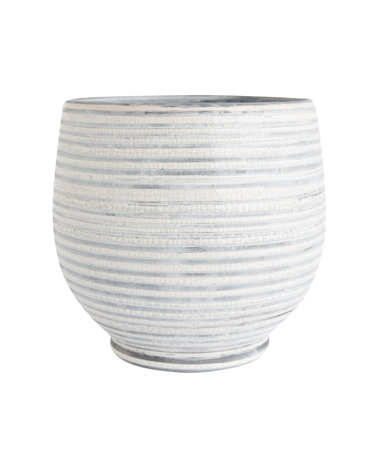 The Gray Stripe Planter redefines stripes in an old world aesthetic. Each planter is a work of art, composed of crackled and raw layers of ceramic, taking the best of both textures. Slight color variations in each vessel makes each one unique.