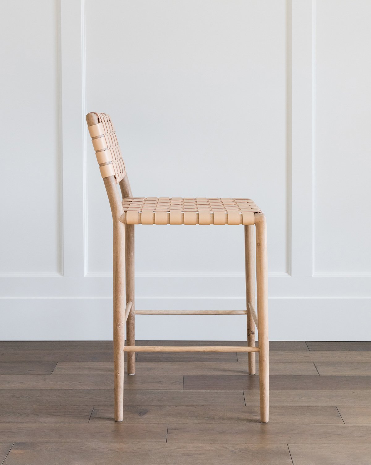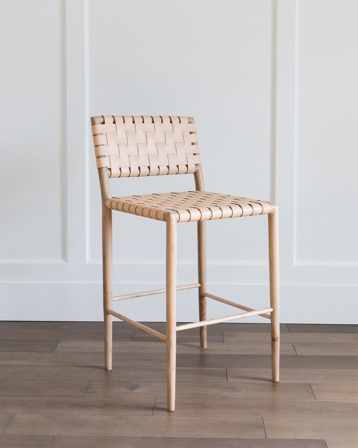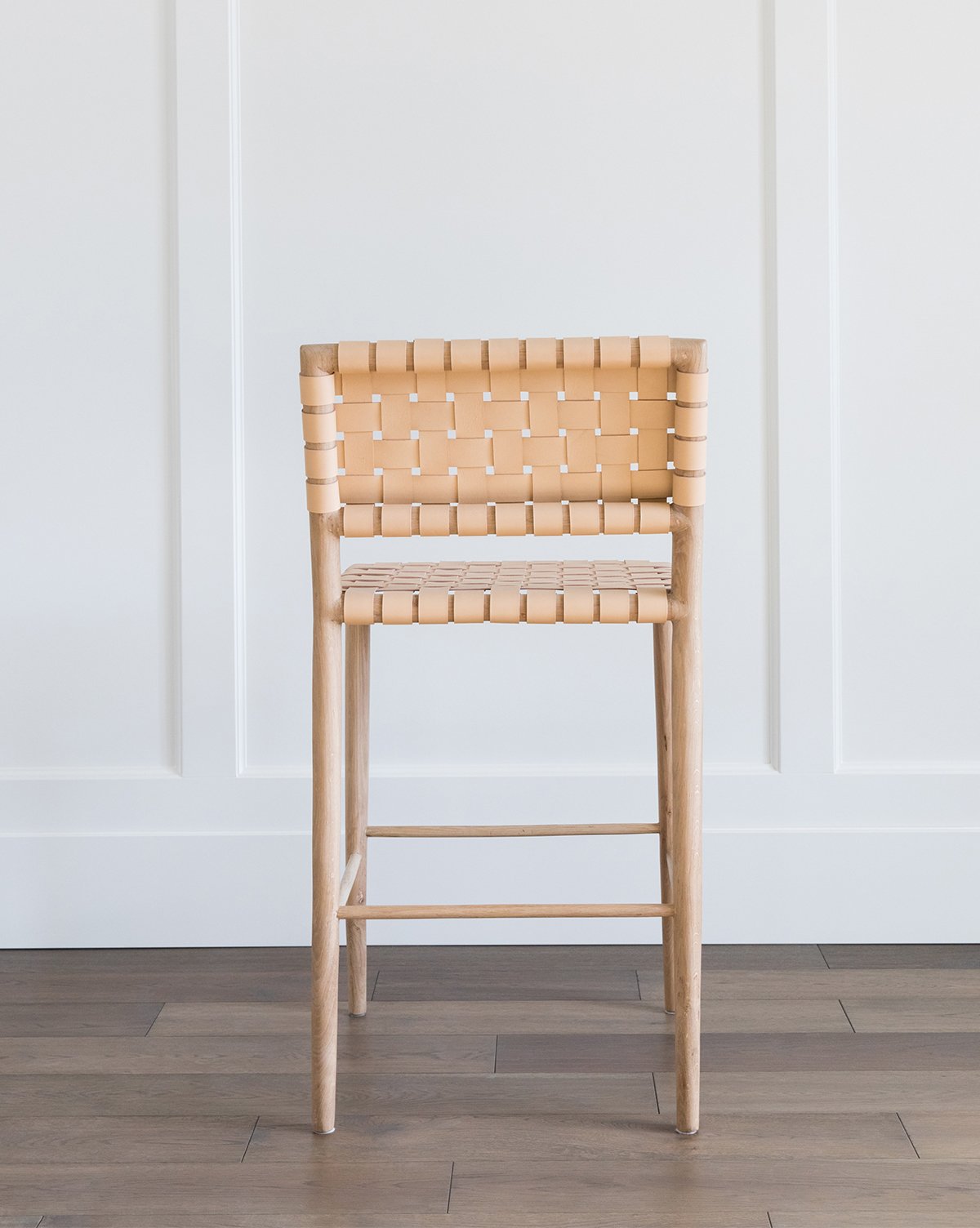 Expertly crafted with acute attention to detail, we designed the Greely Counter Stool with a light and airy, yet sophisticated feel. Woven with aniline dyed leather wrapped around a solid white oak frame featuring slightly tapered legs, this chair instantly elevates your kitchen space with its modern, streamlined silhouette.