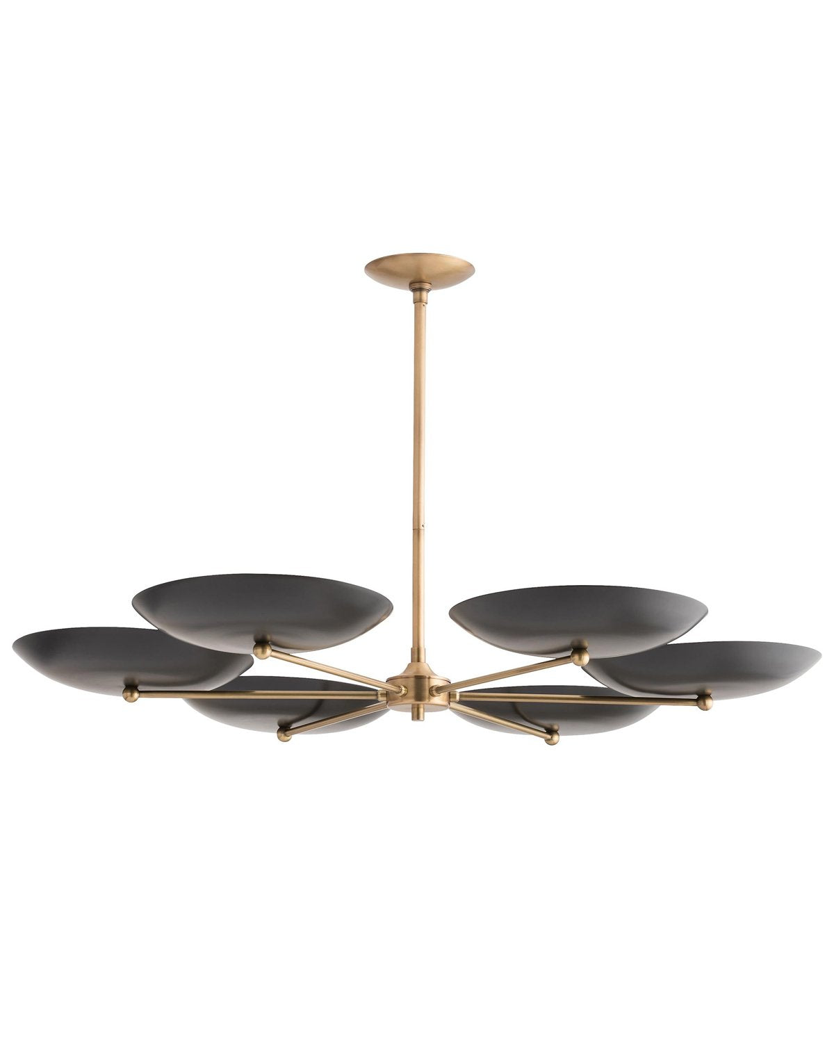 The Griffith Chandelier’s mid-century influence and versatile detailing makes it easy to mix styles in any home. Its antique brass frame, carrying six upward facing bronze shades, creates great contrast while directly the light evenly upward.