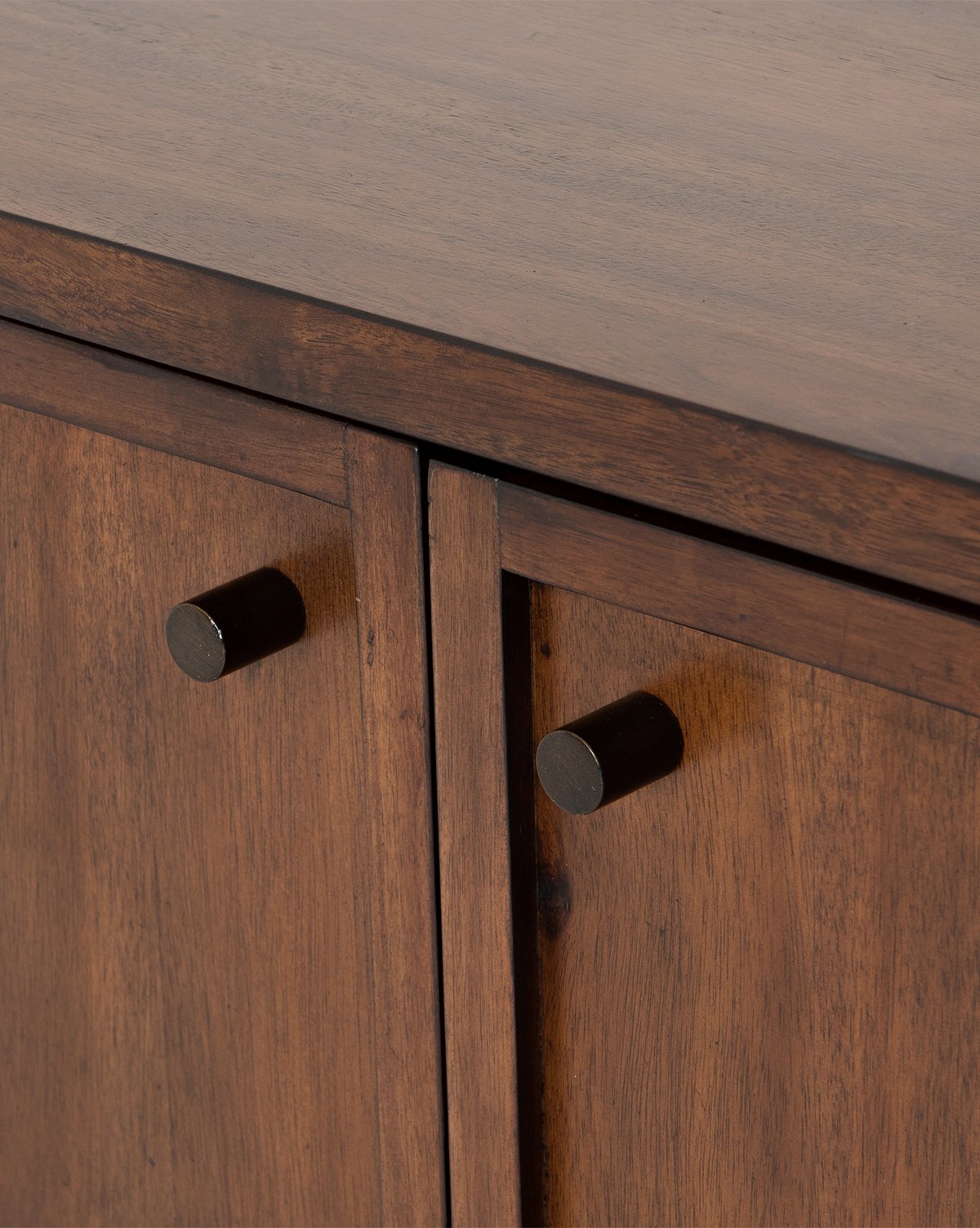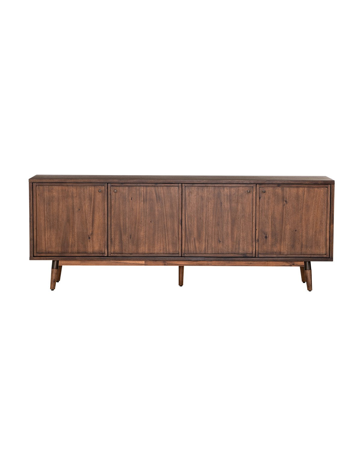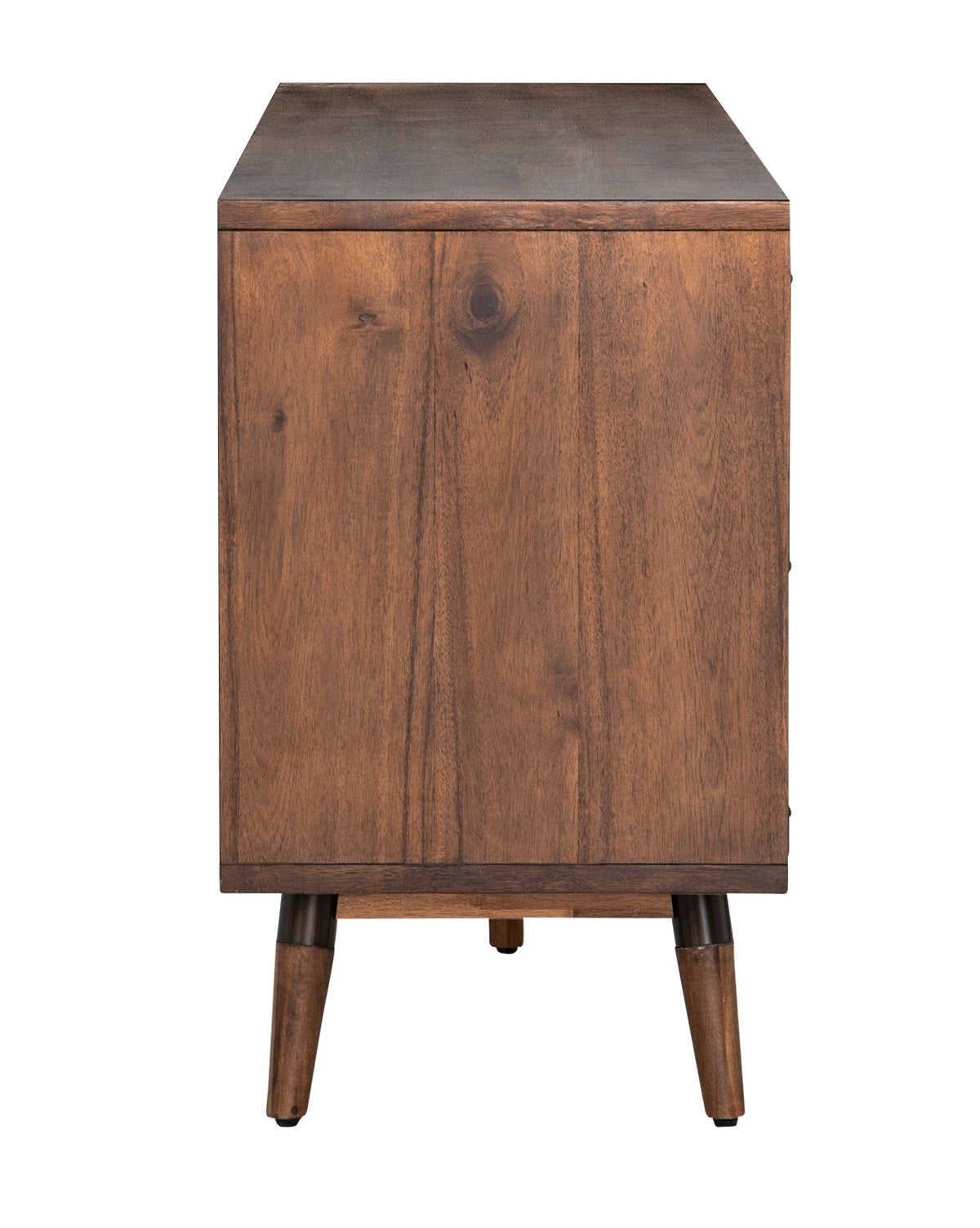 With a modern and streamlined silhouette, the Haldan Sideboard boasts evocative mid-century styling. From the tapered legs to its spacious shape finished in a toasted walnut stain, this piece brings warmth anywhere it’s placed. Whether it’s storing table linens and dinnerware for entertaining, or simply used as a beautiful layering base in your entryway, this refined piece is accented with bronze finished hardware for the perfect finishing touch.