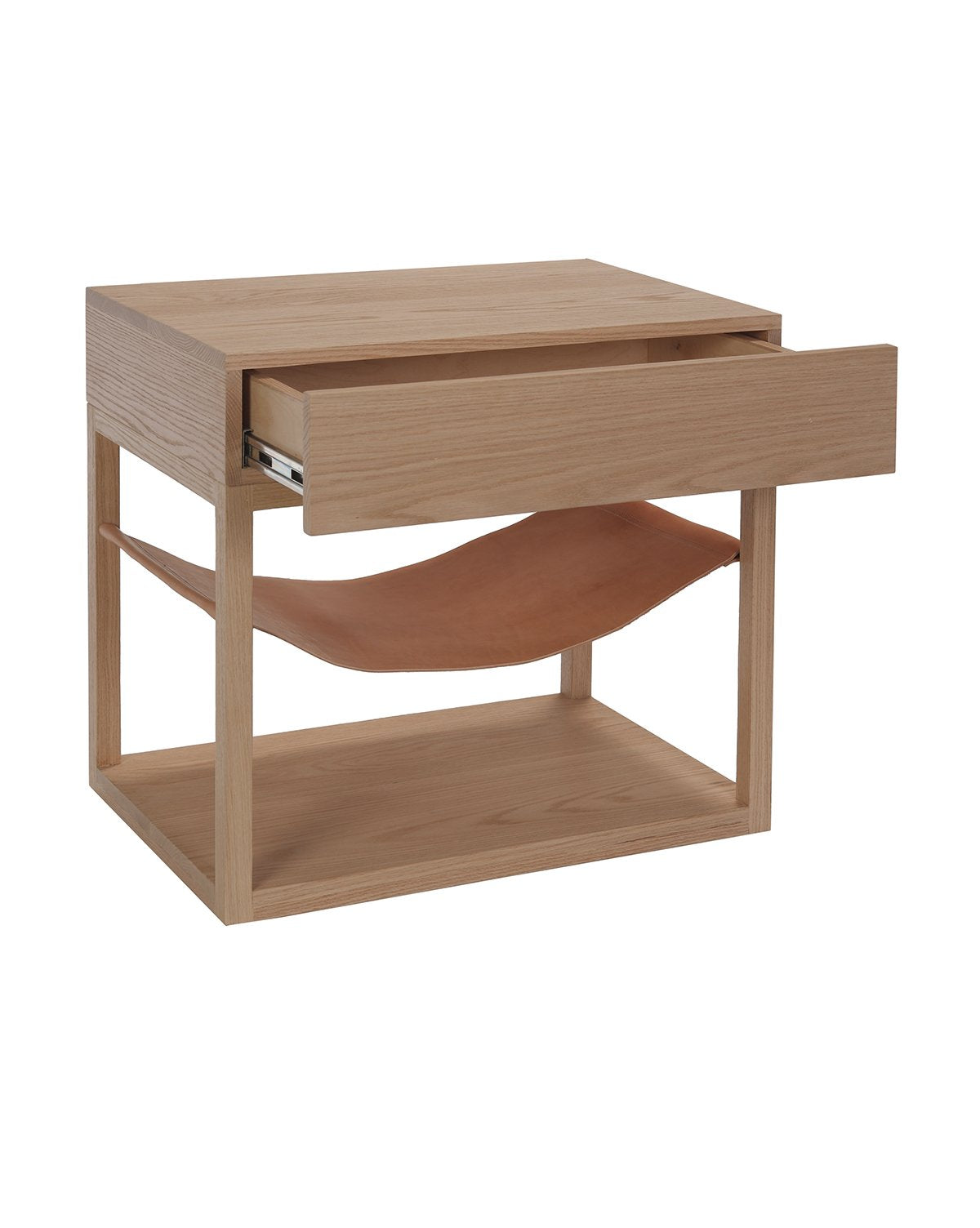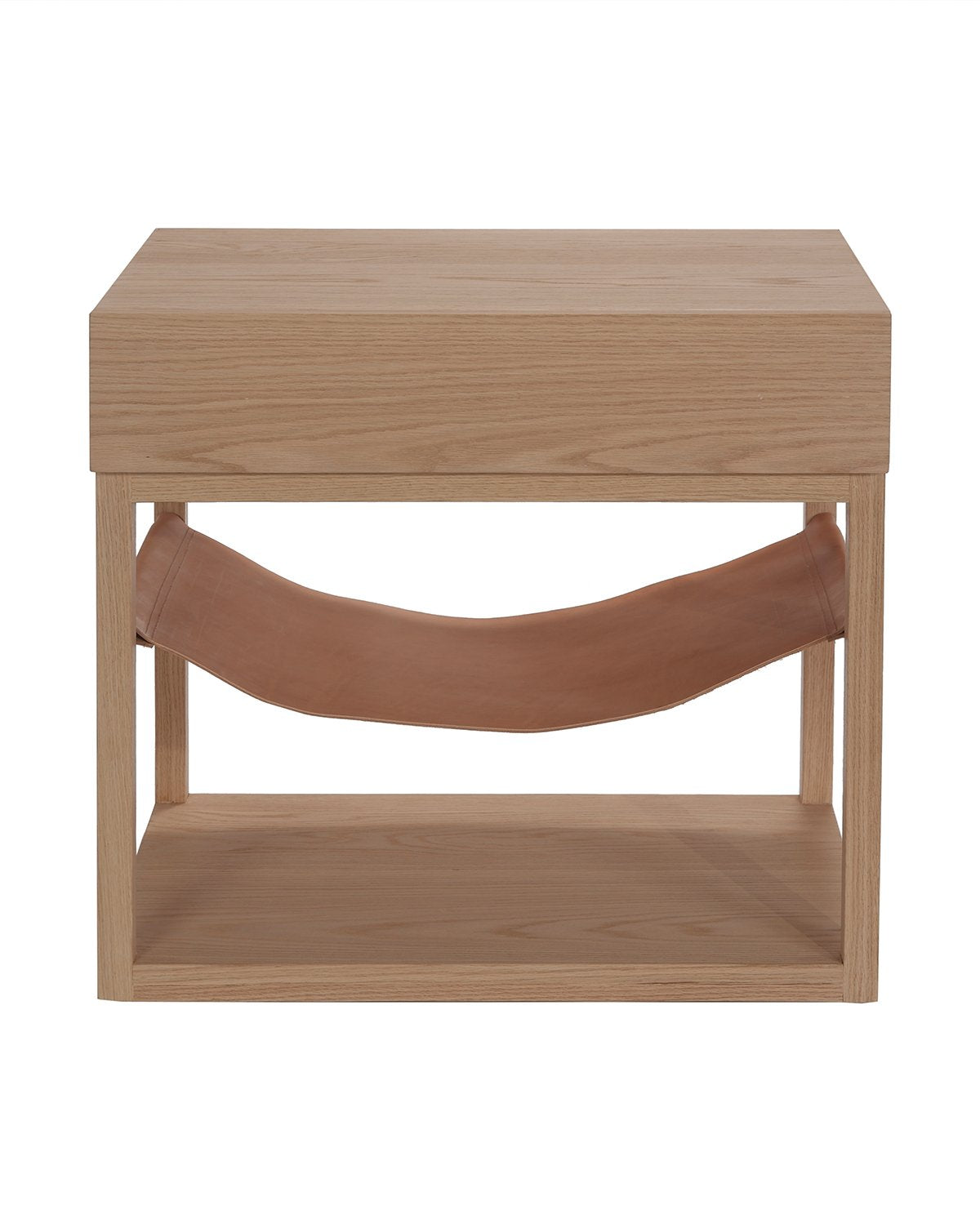Our Hinckley Nightstand is a creative play on modern design. Its leather sling creates an unexpected design element while making it an elevated styling detail. Its handmade solid oak frame goes through a unique production process for maximum quality –– dried to separate the weak wood from the strong, only the strongest oak pieces were selected to create this one-of-a-kind nightstand.