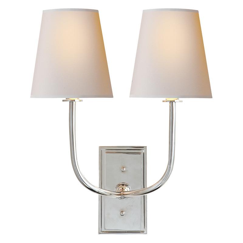 We love the casual elegance of this double sconce. It's graceful curves form arms holding natural paper shades that give off a soft glow.