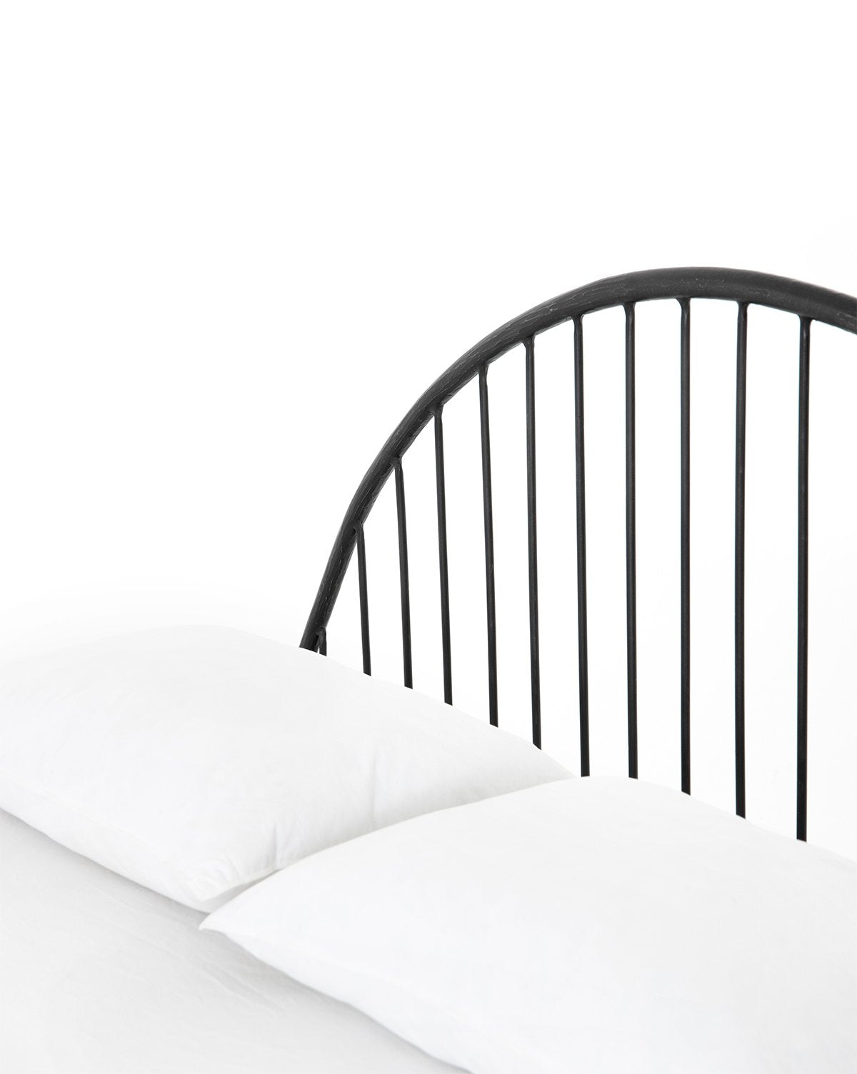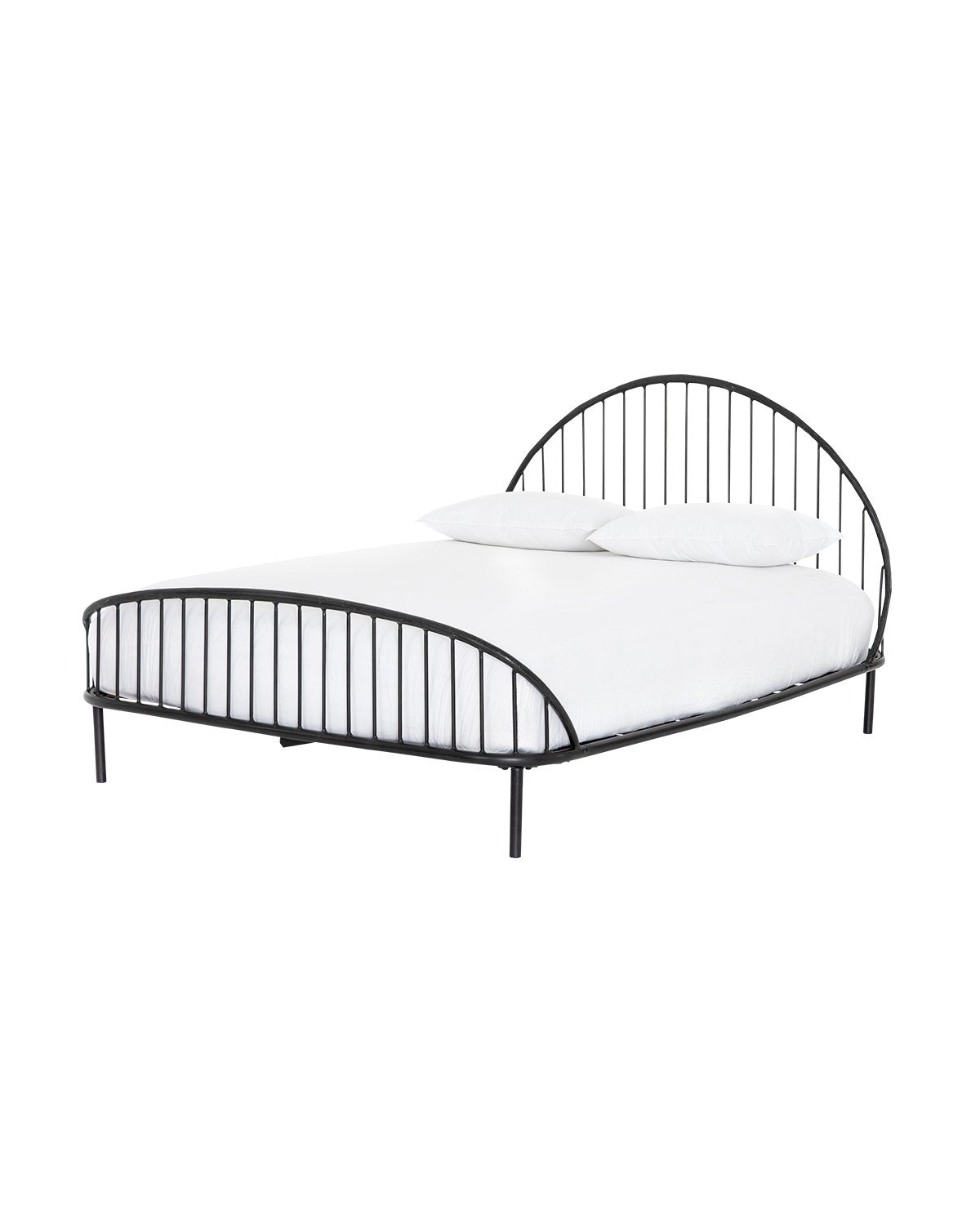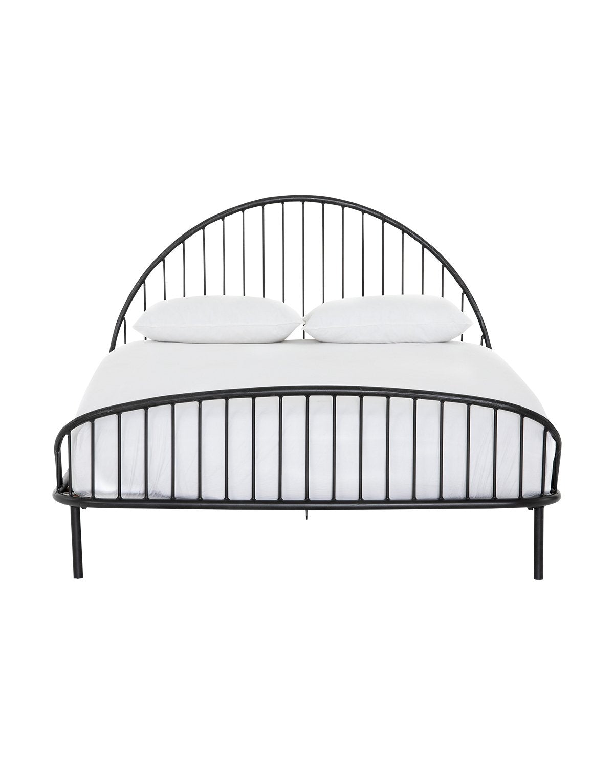 Drawing the eye with its unique shape and open railing detail, the Irving Iron Bed softens your bedroom design with hand-wrought arched head and footboards. Elevated by simple iron legs, its uncommon form brings a light and airy feel to your space, even with its deep modern hue.
