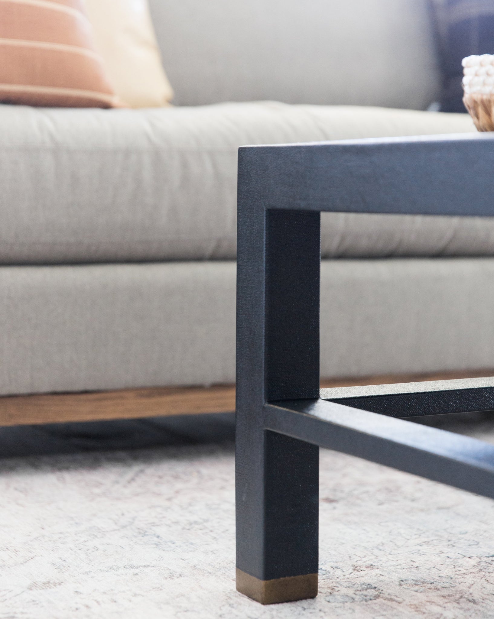 This coffee table’s simple rectangular base helps highlights other elements of its design, like its faux Belgian linen finish and brass capped feet. It’s the perfect canvas to display your beloved coffee table books, trays, and accessories.