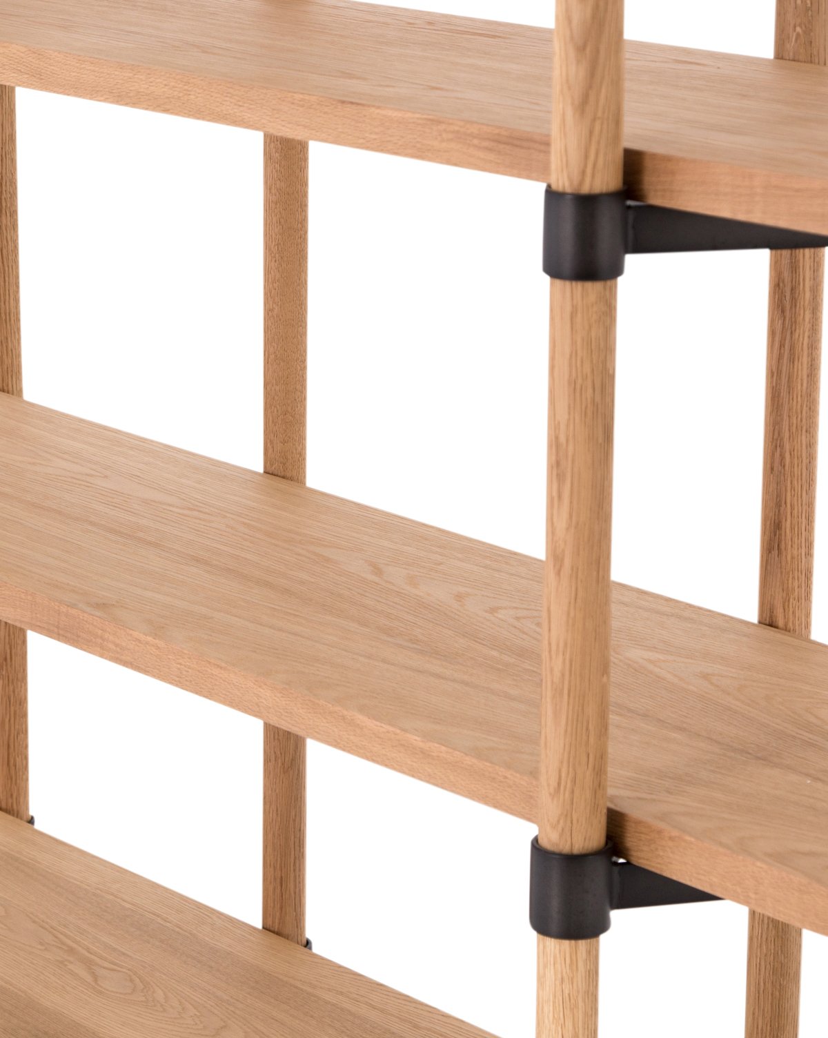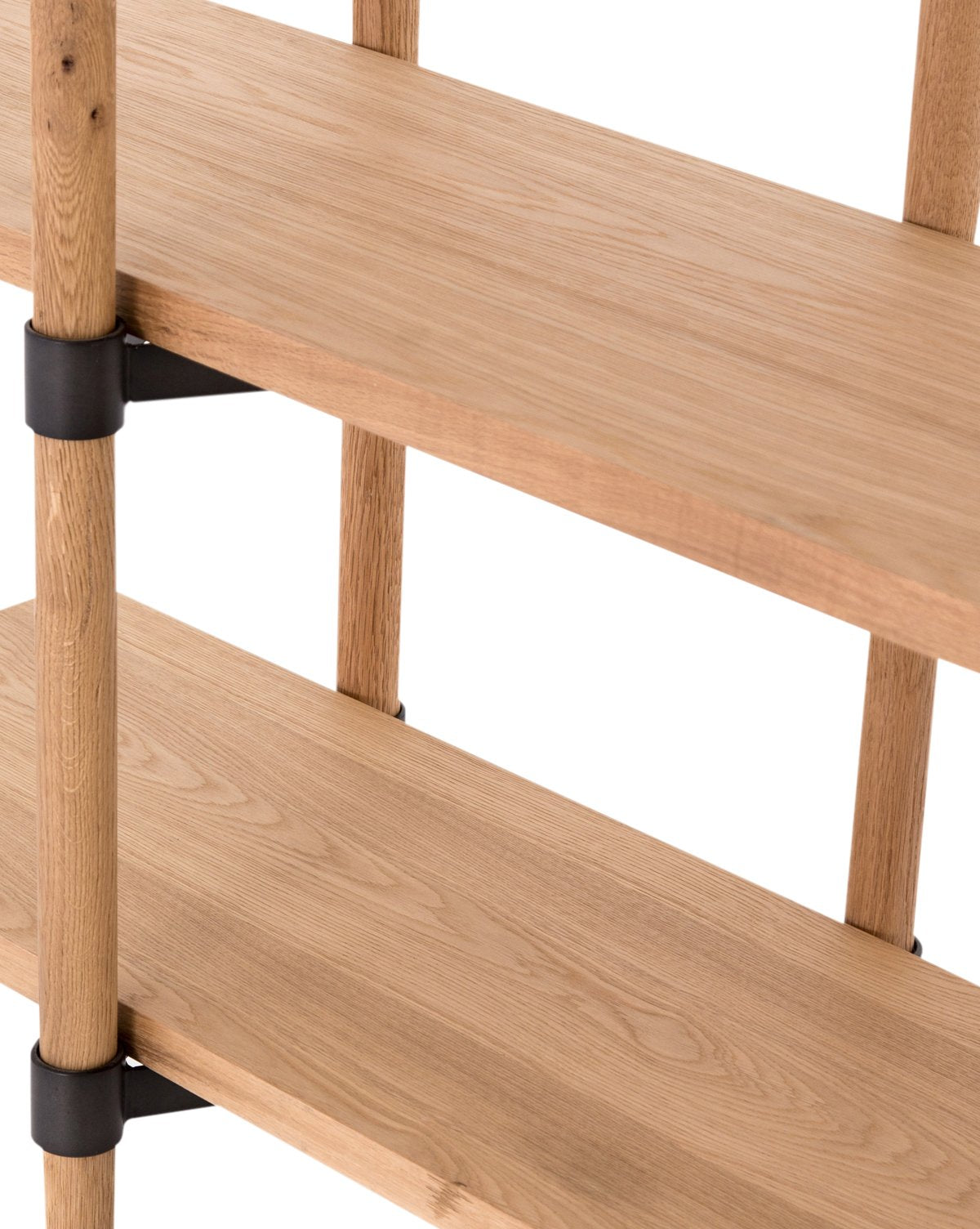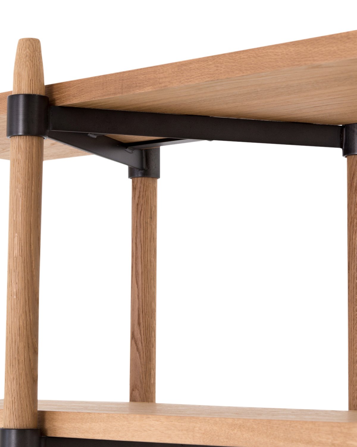 The Jude Bookshelf carries a mid-century form that is industrial and airy. Its long oak shelves and exposed black iron joints create the perfect contrast for displaying your books and knick-knacks.