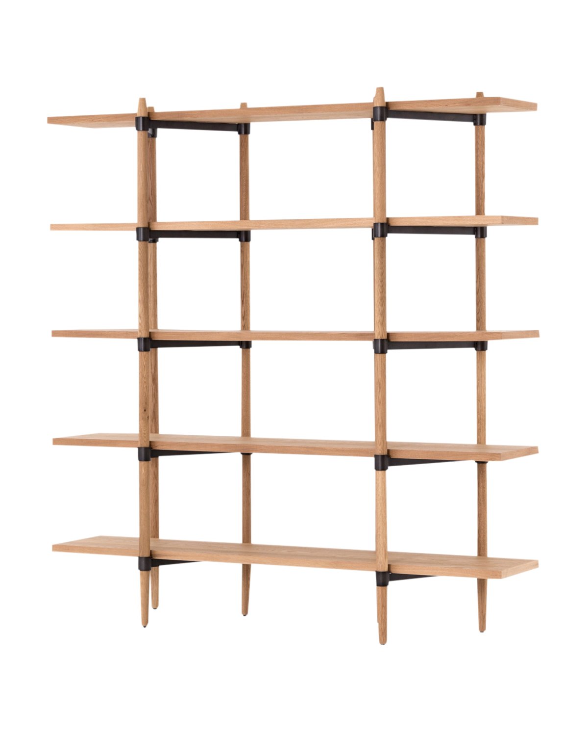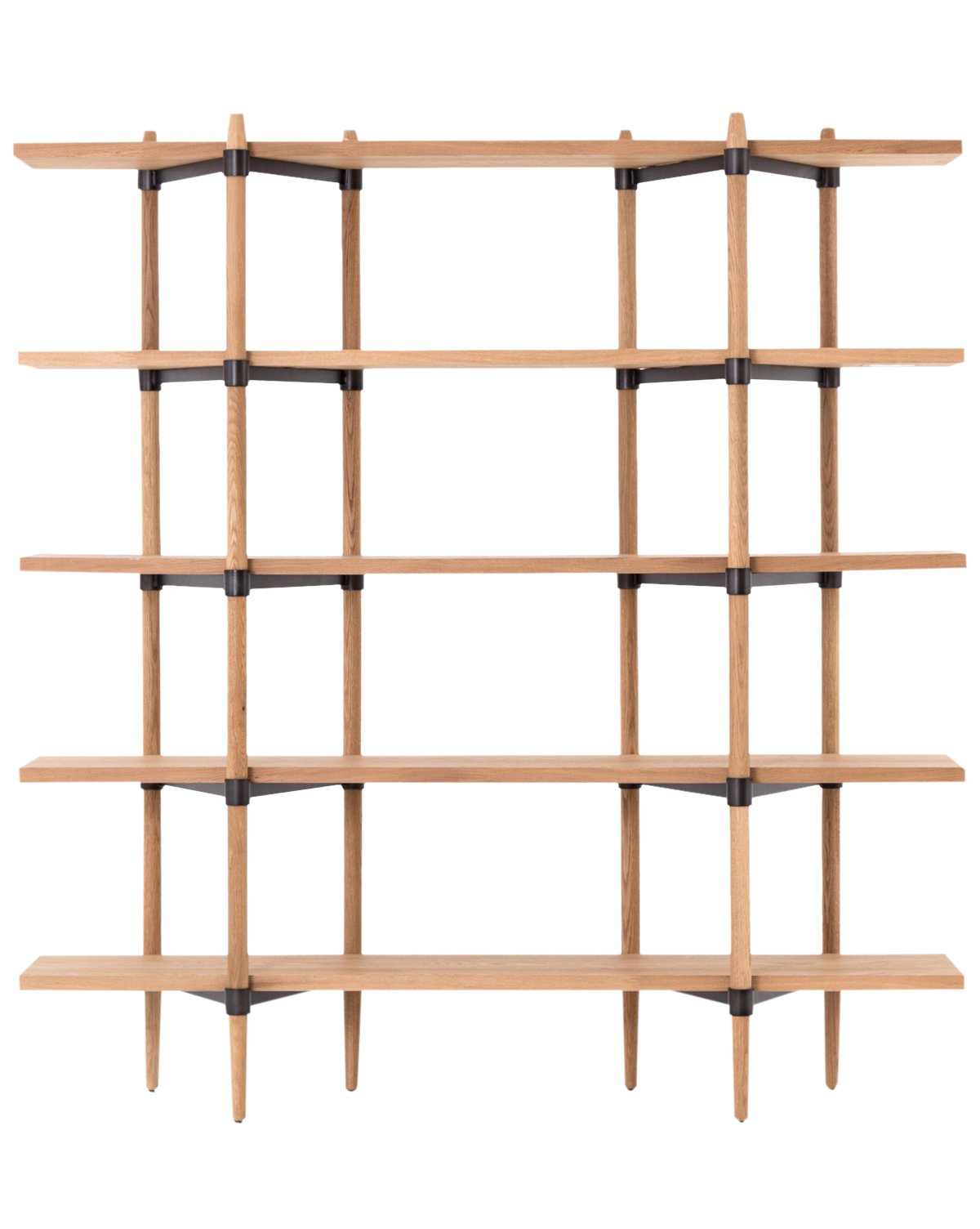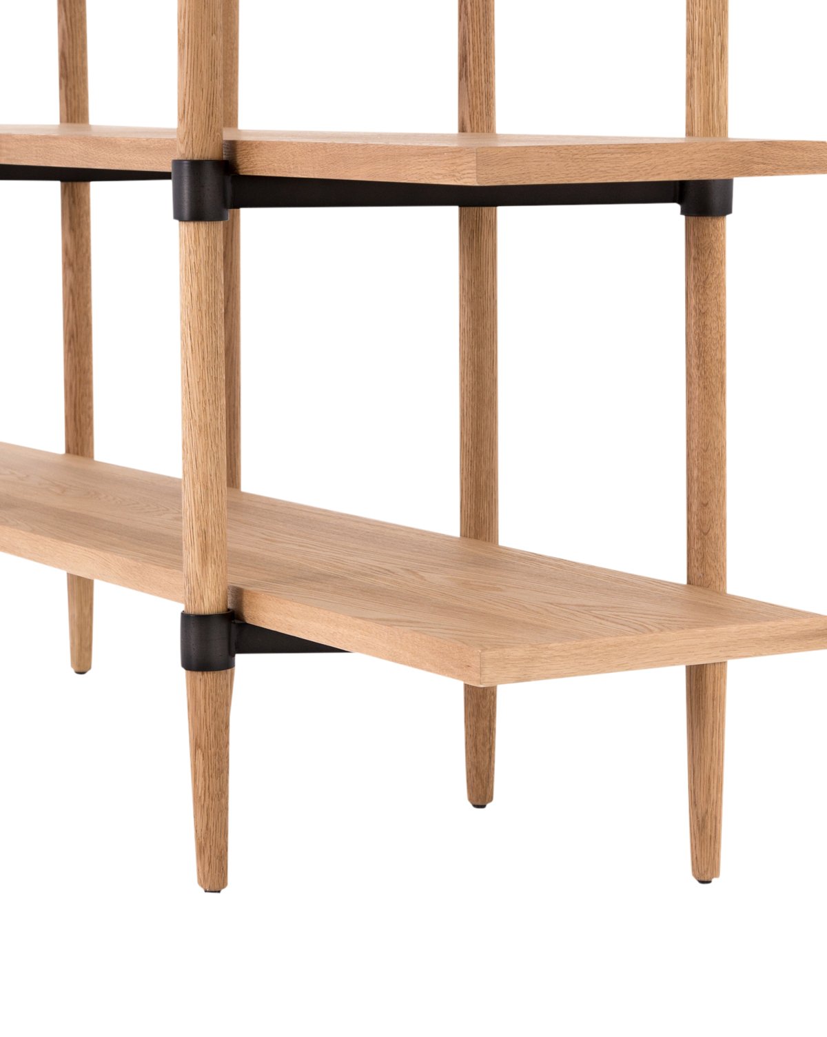 The Jude Bookshelf carries a mid-century form that is industrial and airy. Its long oak shelves and exposed black iron joints create the perfect contrast for displaying your books and knick-knacks.
