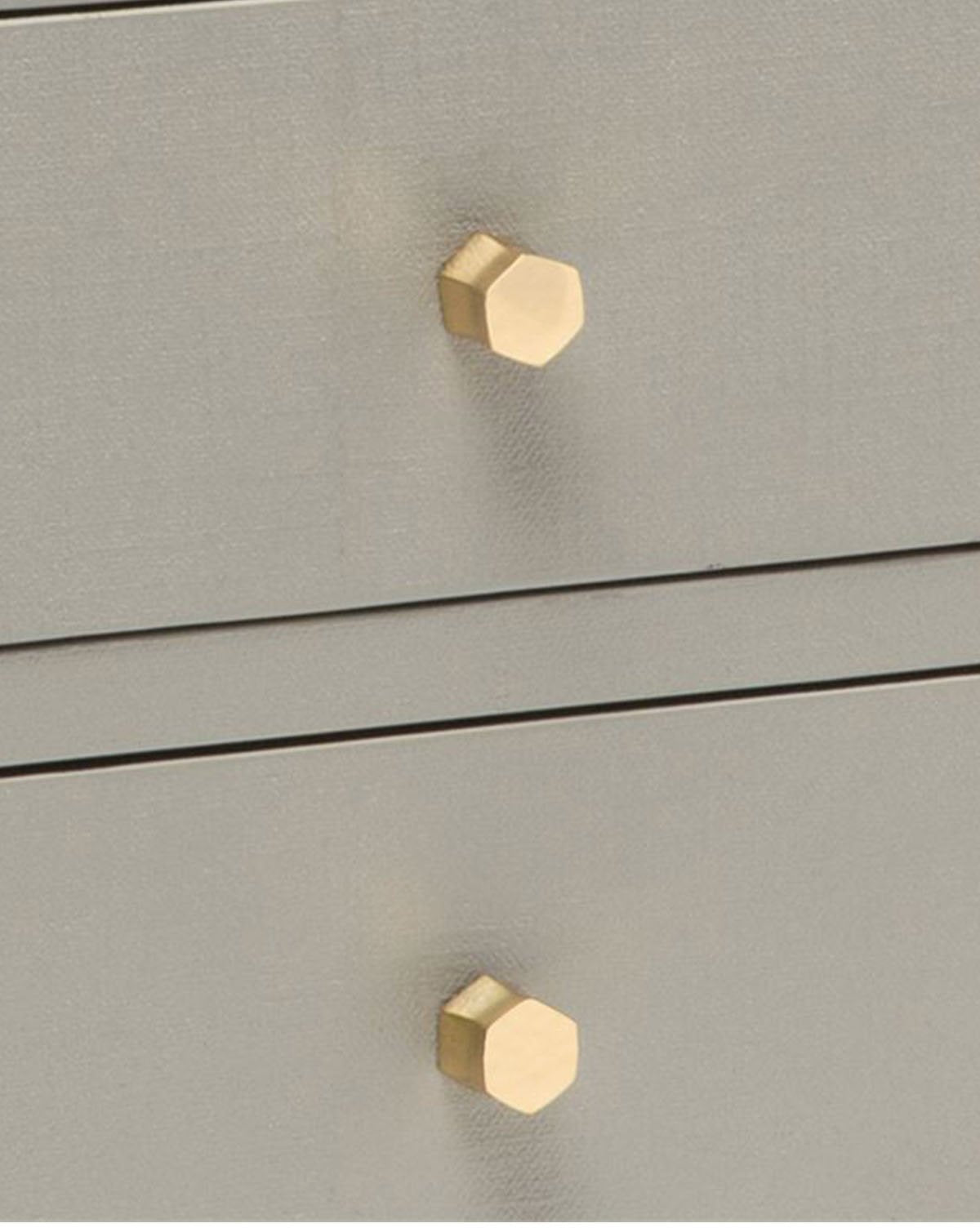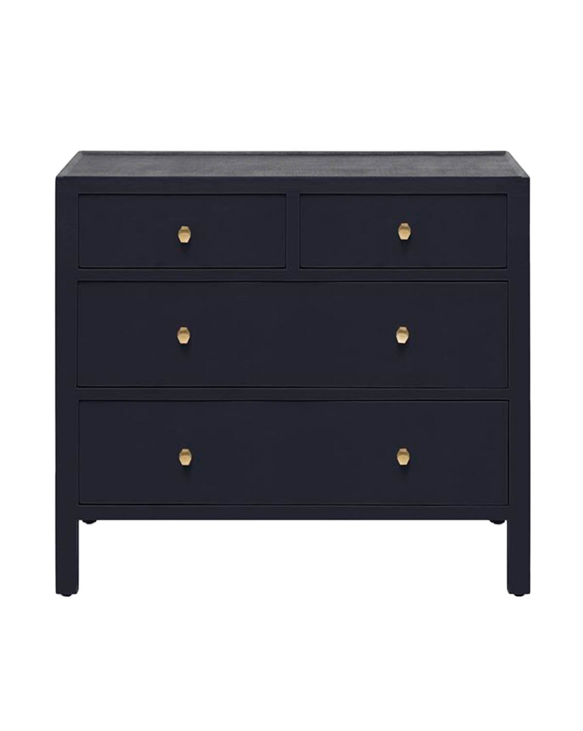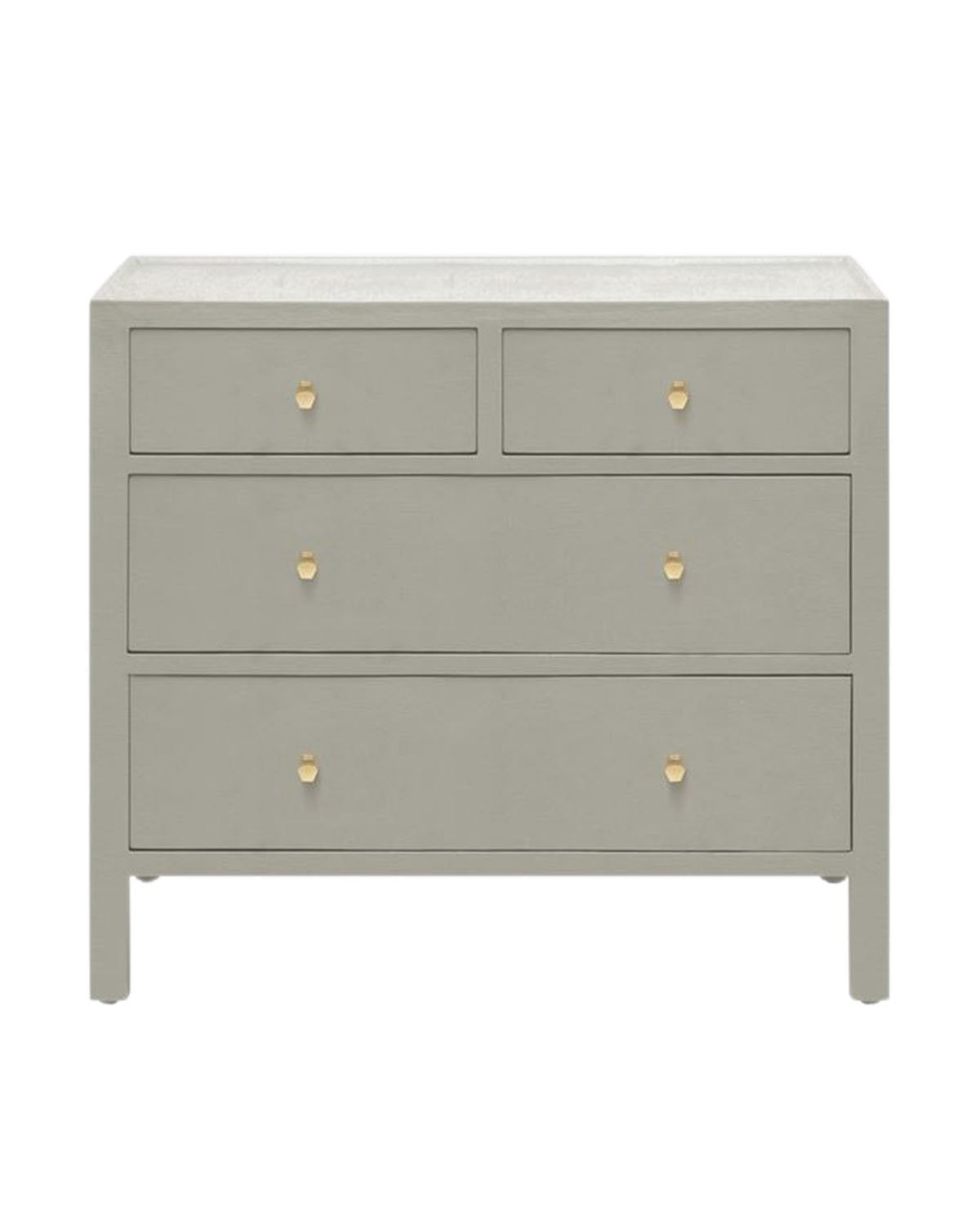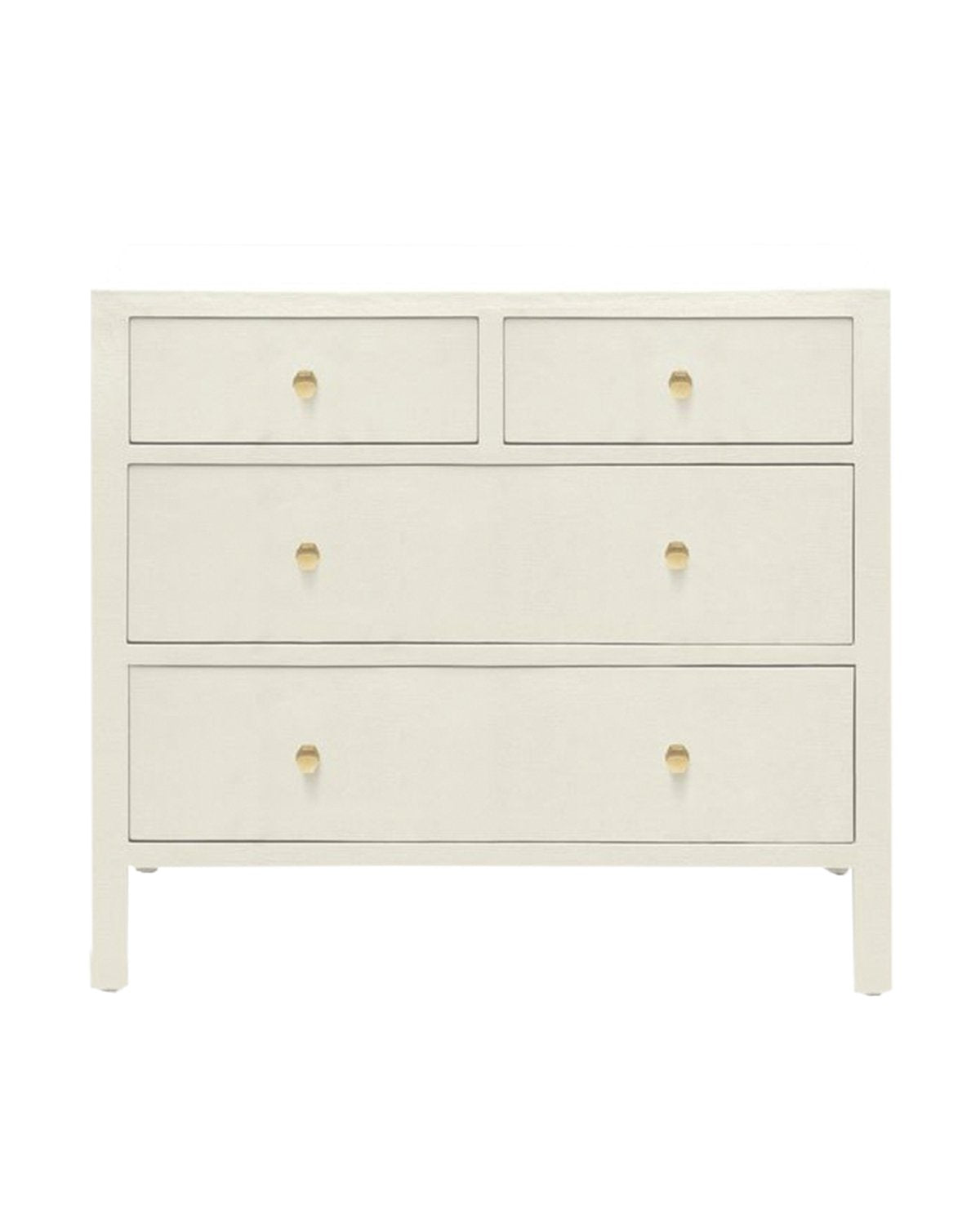 With an elegant design and touchable texture, the Kira Dresser is finished in three refined hues of faux linen. Its 4-drawers lends plenty of storage to your space, while expertly shaped brass pulls add glamorous dimension, updating the classic design.