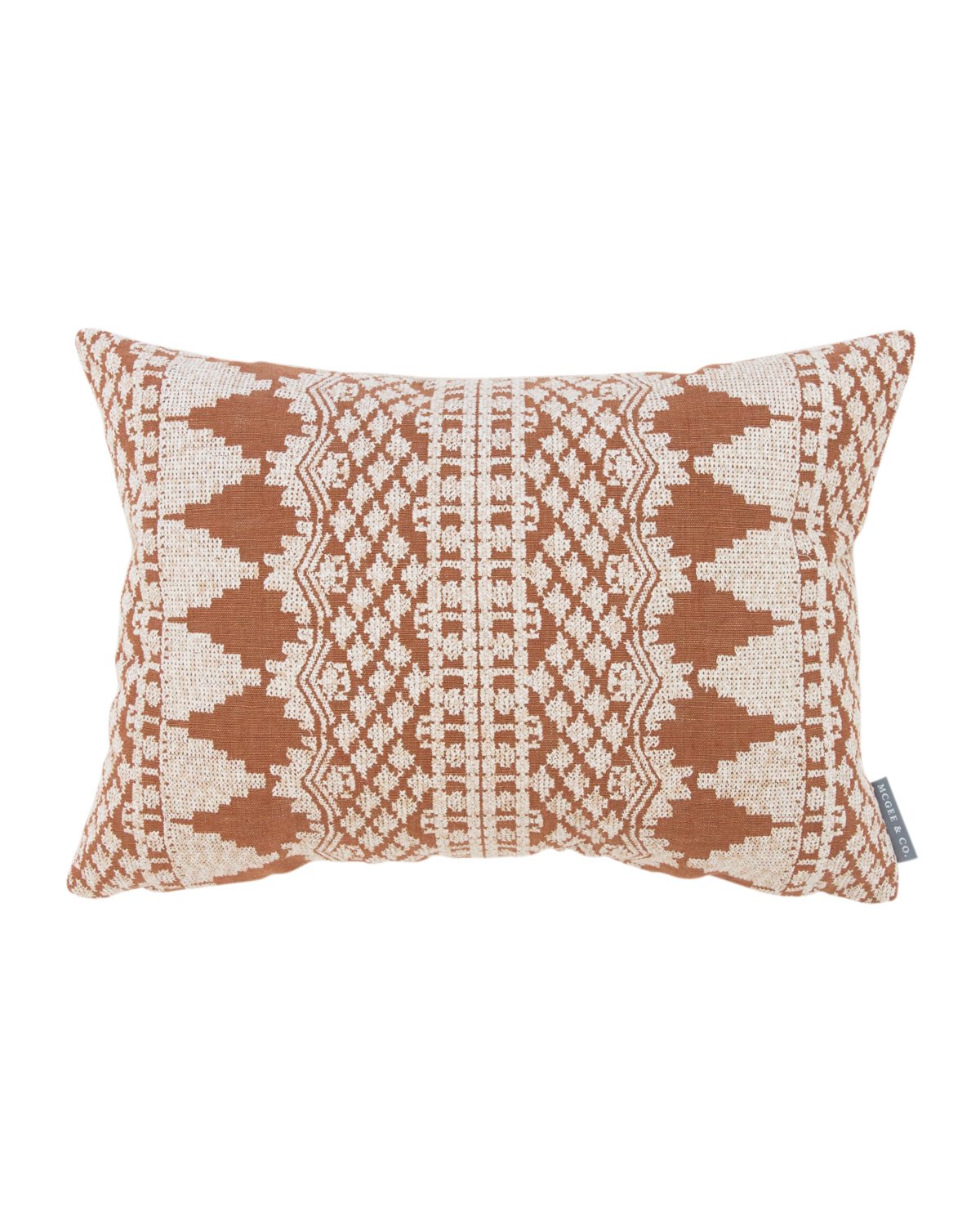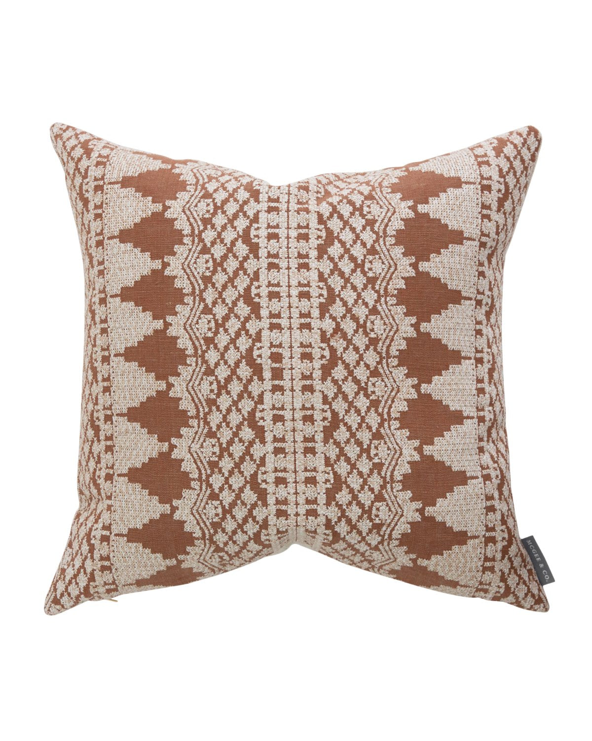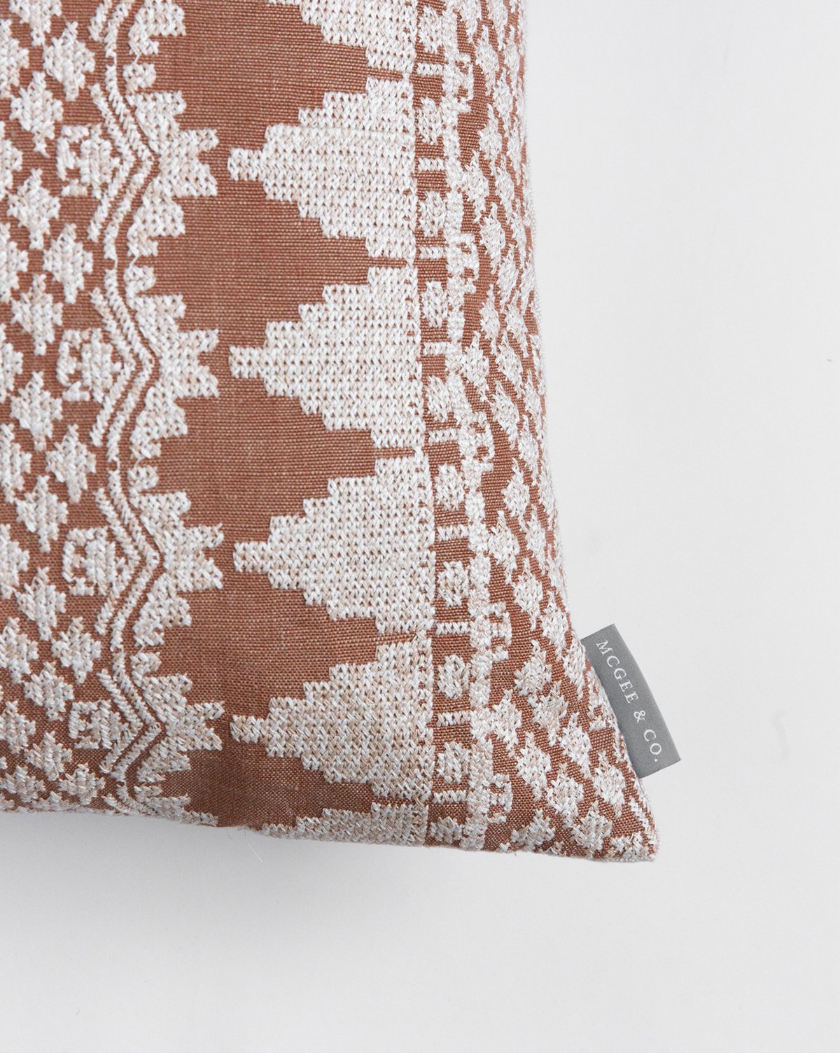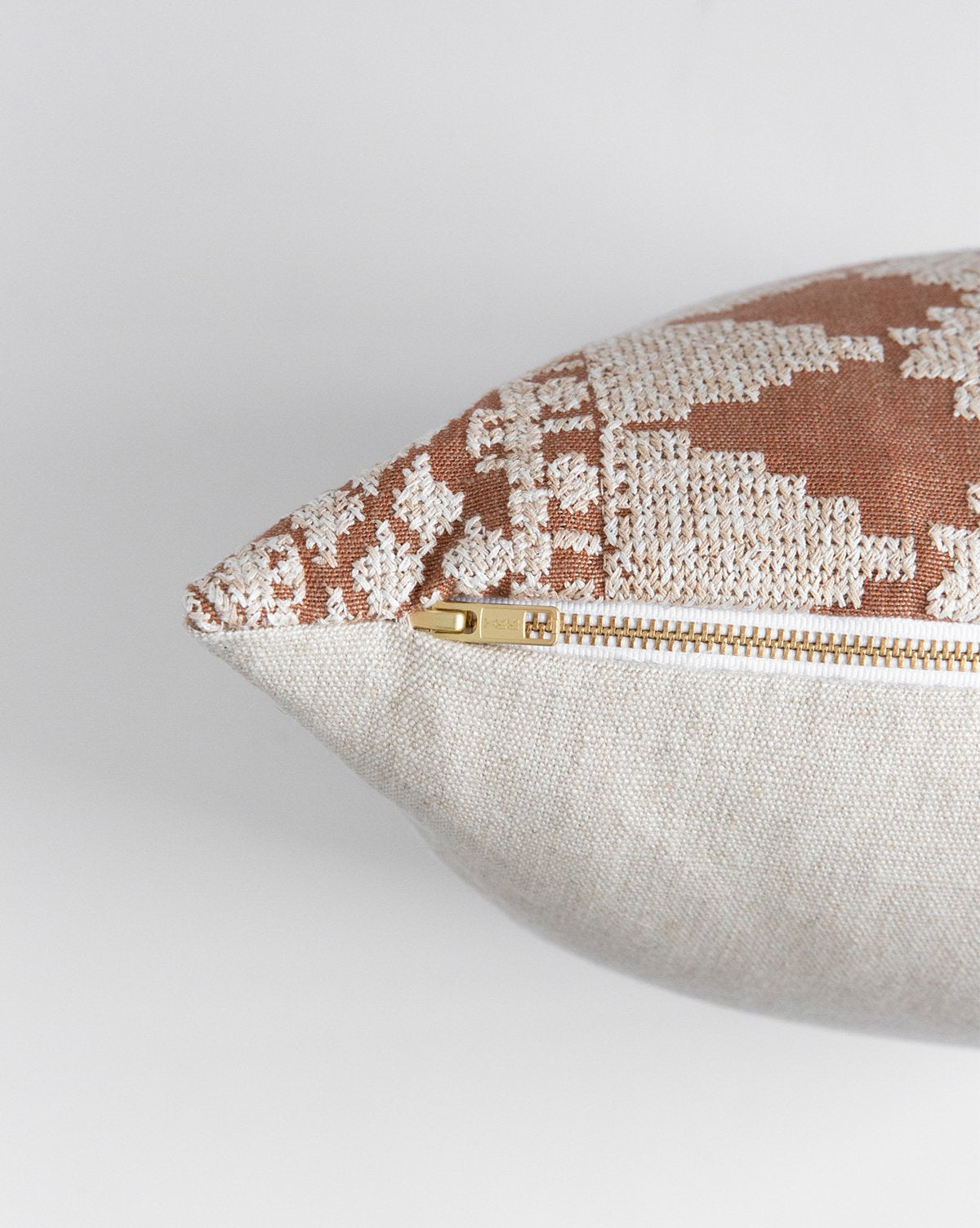 The Lisbeth pillow cover is crafted in India, and includes all the handmade allure of the country’s textiles. Its cross-stitched pattern was designed with subtle tonal variation to bring added dimensional form to its rare rust color––all built on a foundation of jute and linen.